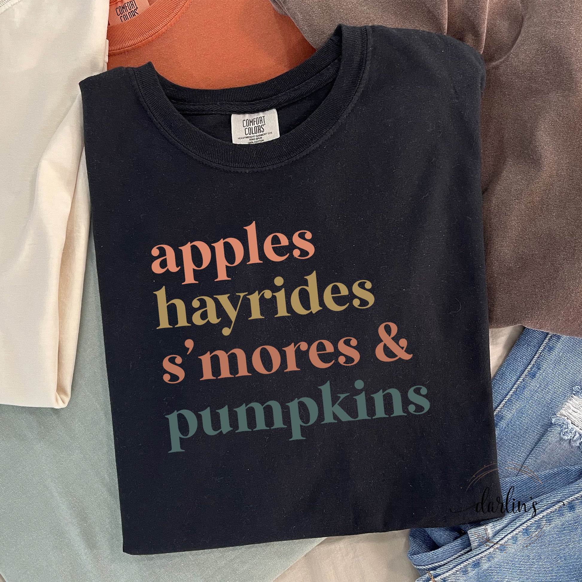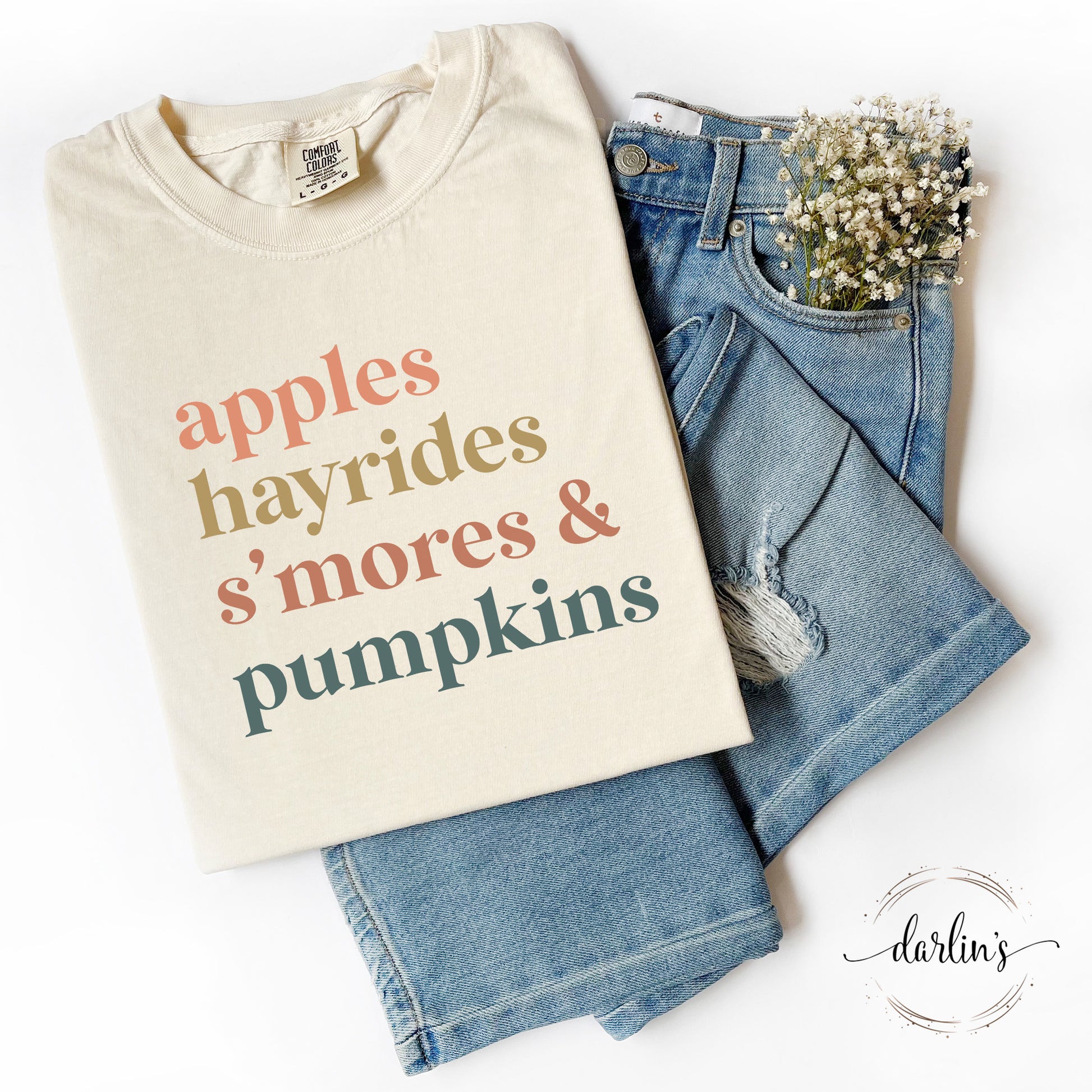 The Apples Hayrides Smores And Pumpkins Shirt makes every outfit playful. Perfect for everyday wear or gifting.