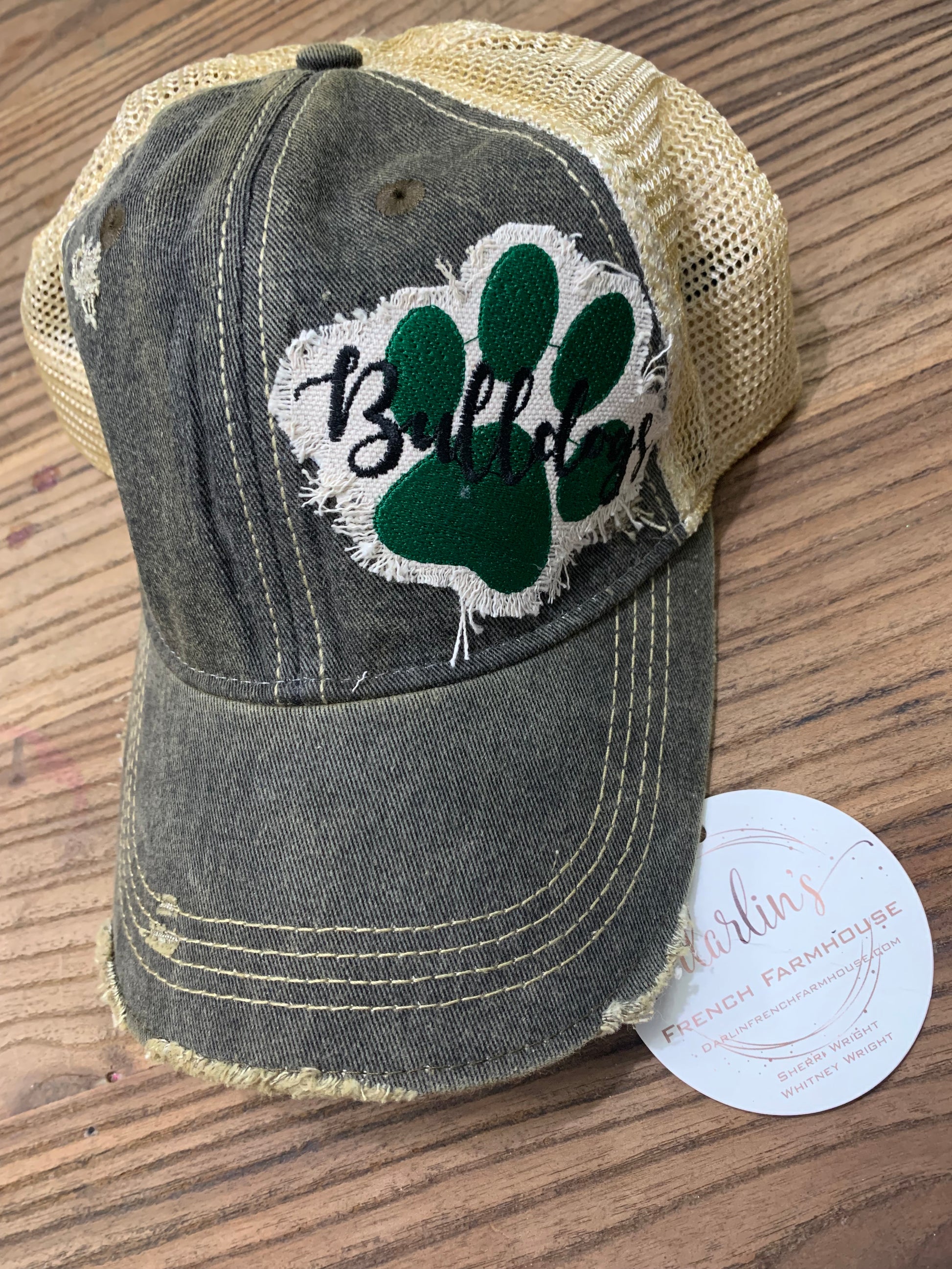 Sleek black cap featuring green paw print and bulldog design, complemented by stylish tan mesh backing. Adjustable snapback ensures perfect fit for any Bulldog enthusiast. A must-have accessory for showing your Bulldog pride.