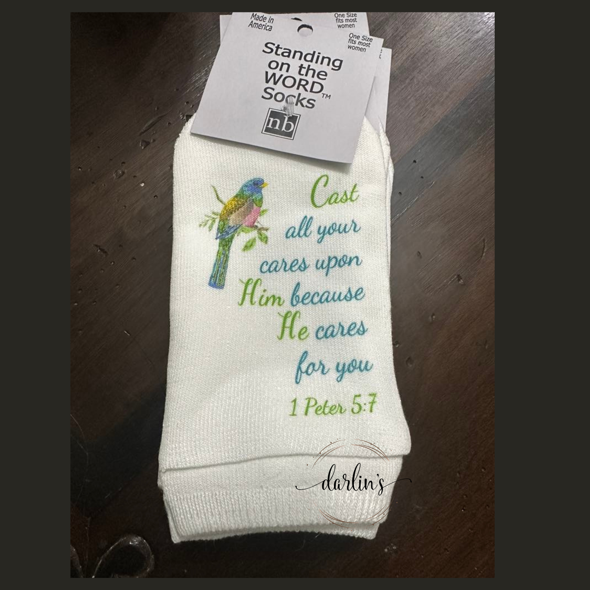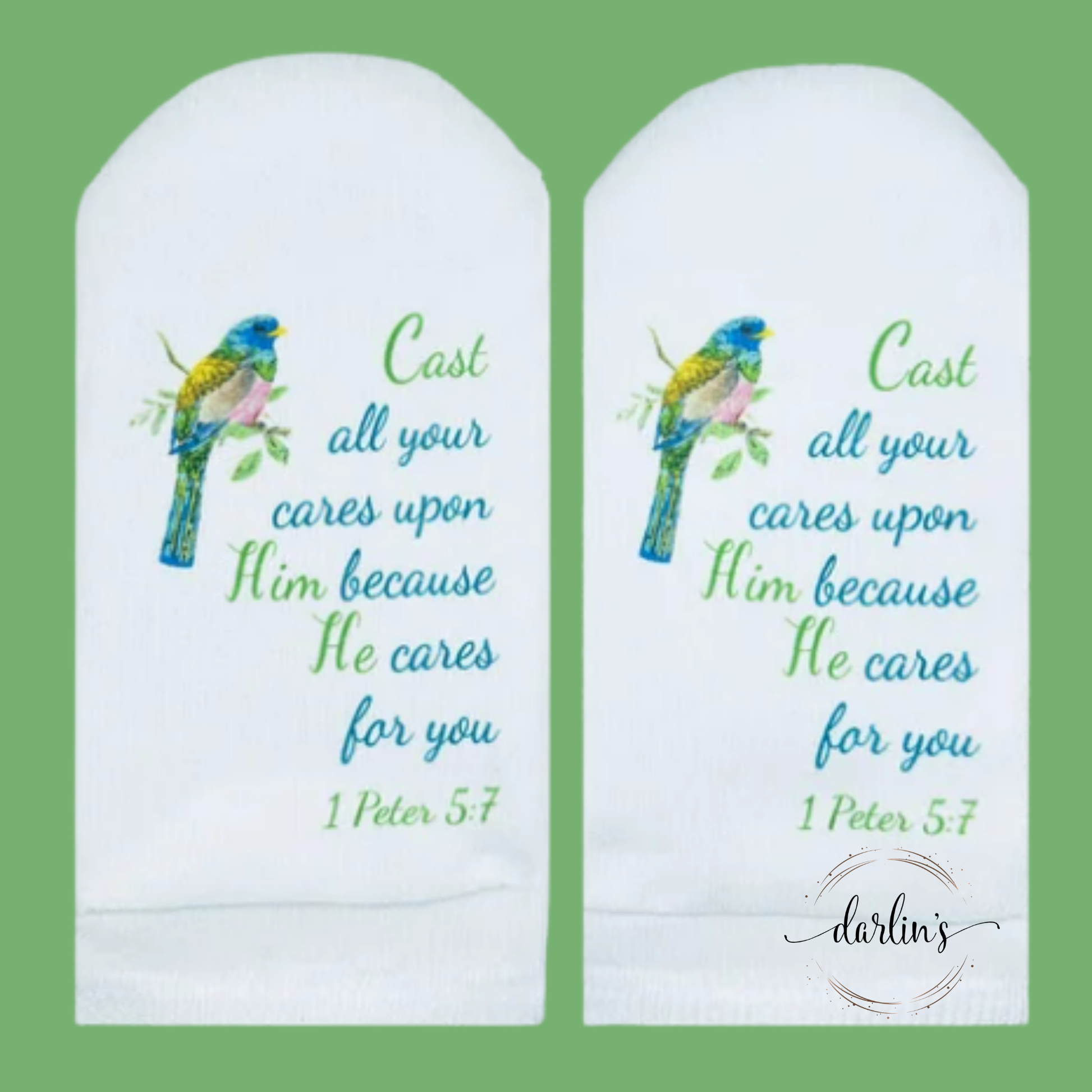 These refined socks feature the comforting scripture from 1 Peter 5:7, "Cast All Your Cares Upon Him," offering a gentle reminder to release worries and embrace peace. The elegant design subtly incorporates this inspiring message, making these socks a meaningful accessory for those who seek both style and spiritual solace. Ideal as a thoughtful gift or a personal symbol of trust and serenity, they blend sophistication with heartfelt encouragement.