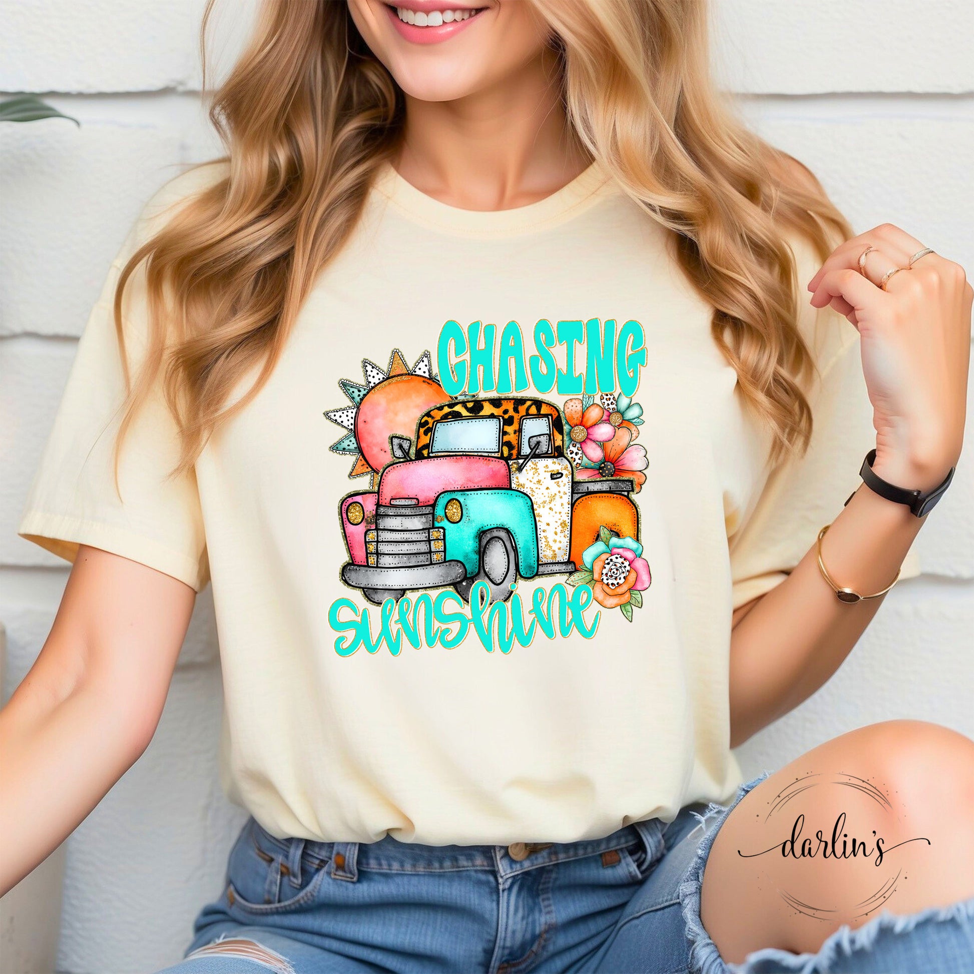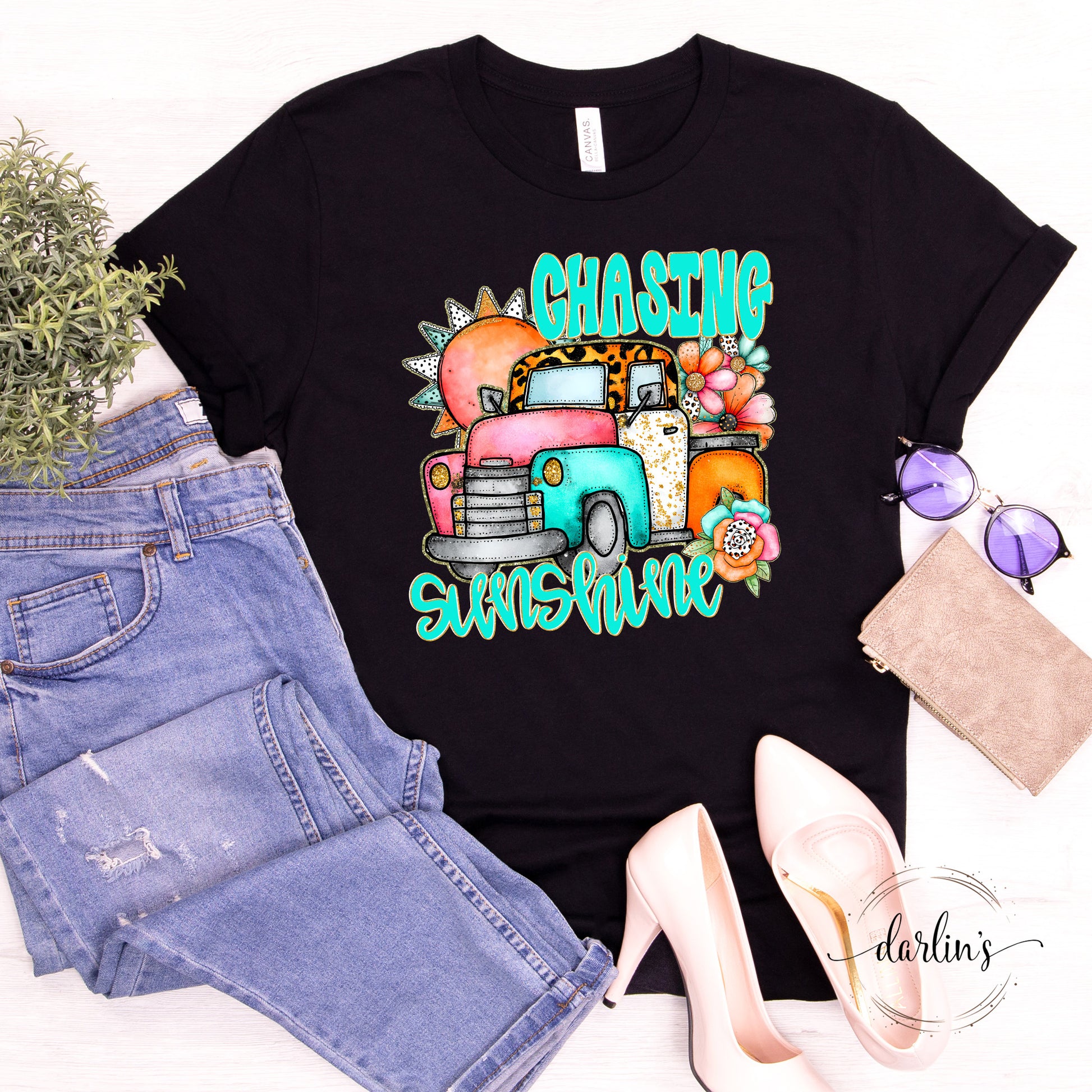 Brighten your day with the Chasing Sunshine graphic top, designed to bring a playful burst of joy to your wardrobe. This lively top features a cheerful design that captures the essence of sunny adventures and carefree moments. Perfect for casual outings or relaxed weekends, it pairs effortlessly with your favorite jeans or shorts. Embrace the sunny vibes and let your style shine as you chase every ray of happiness in this fun and comfortable top.