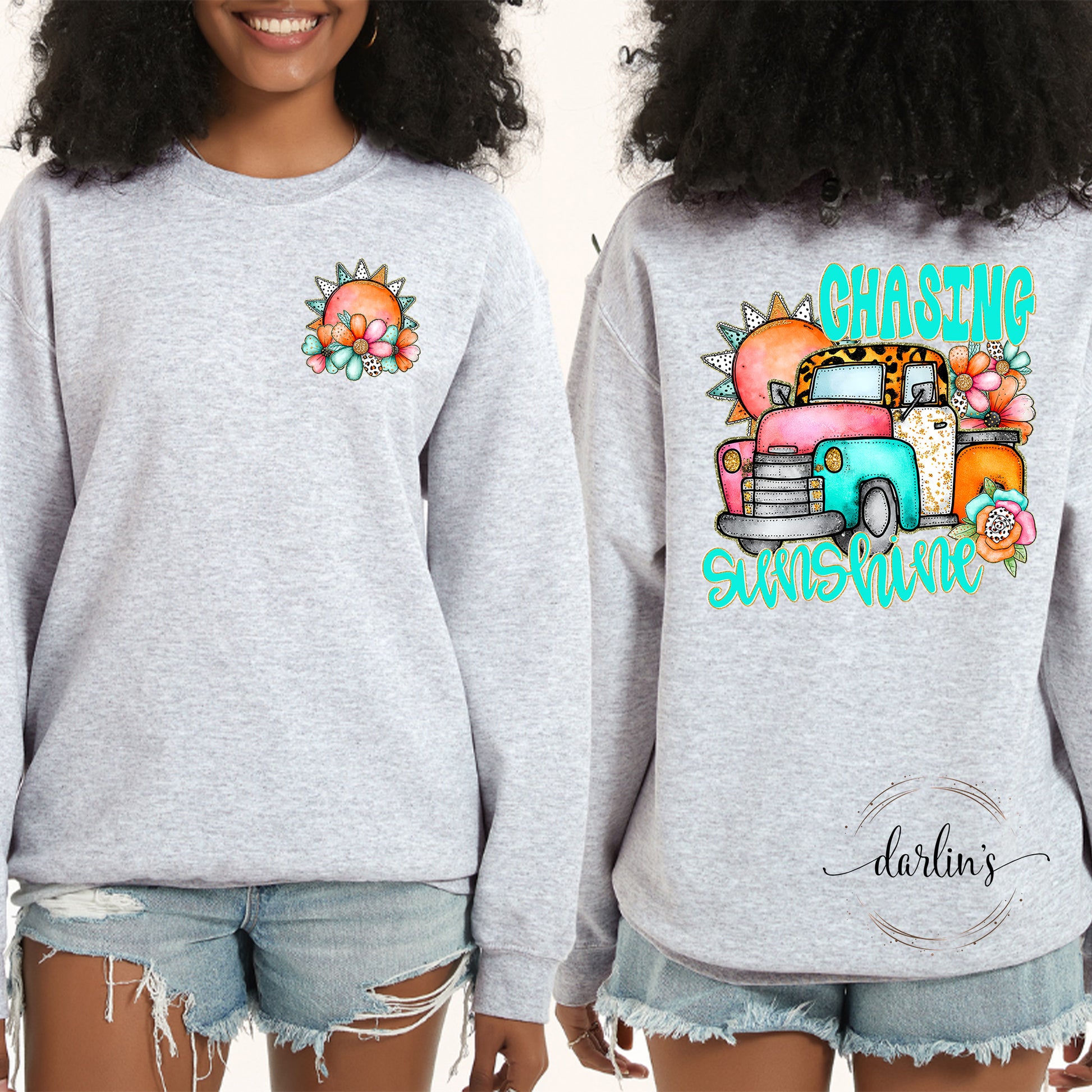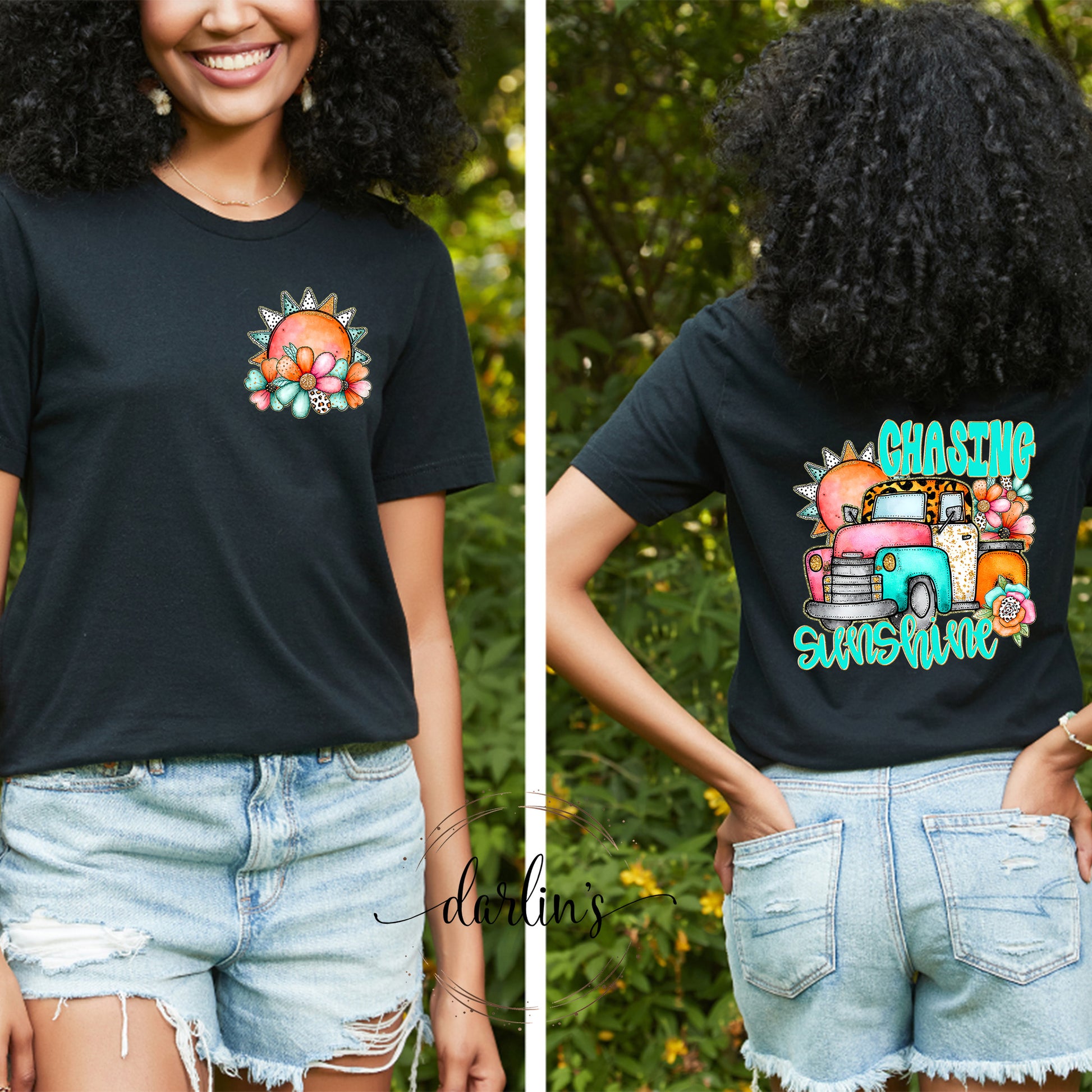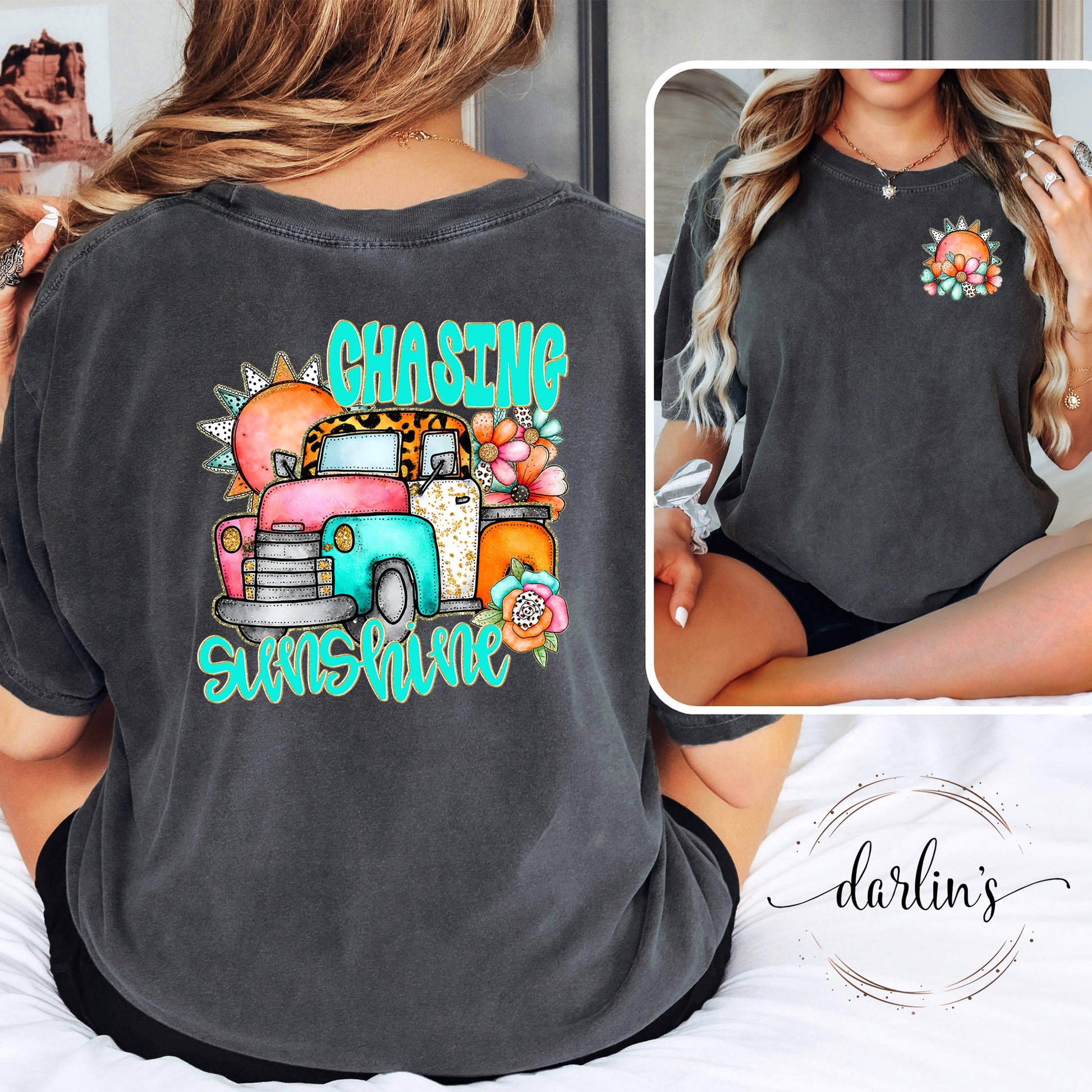 Add a splash of fun to your everyday look with the Chasing Sunshine top. This top showcases a cheerful graphic that captures the spirit of sunny days. Made for comfort and easy pairing with your favorite casual pieces, this top invites you to embrace lighthearted moments and chase sunshine wherever you go.