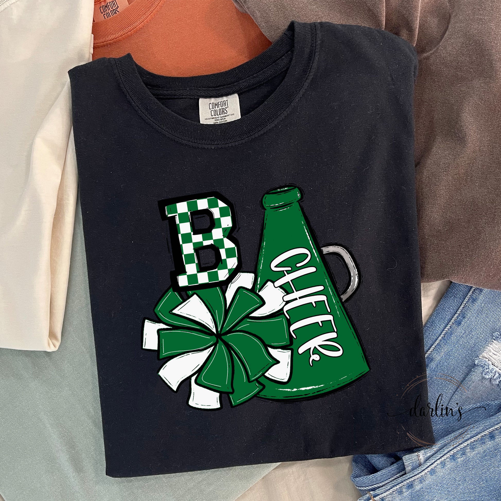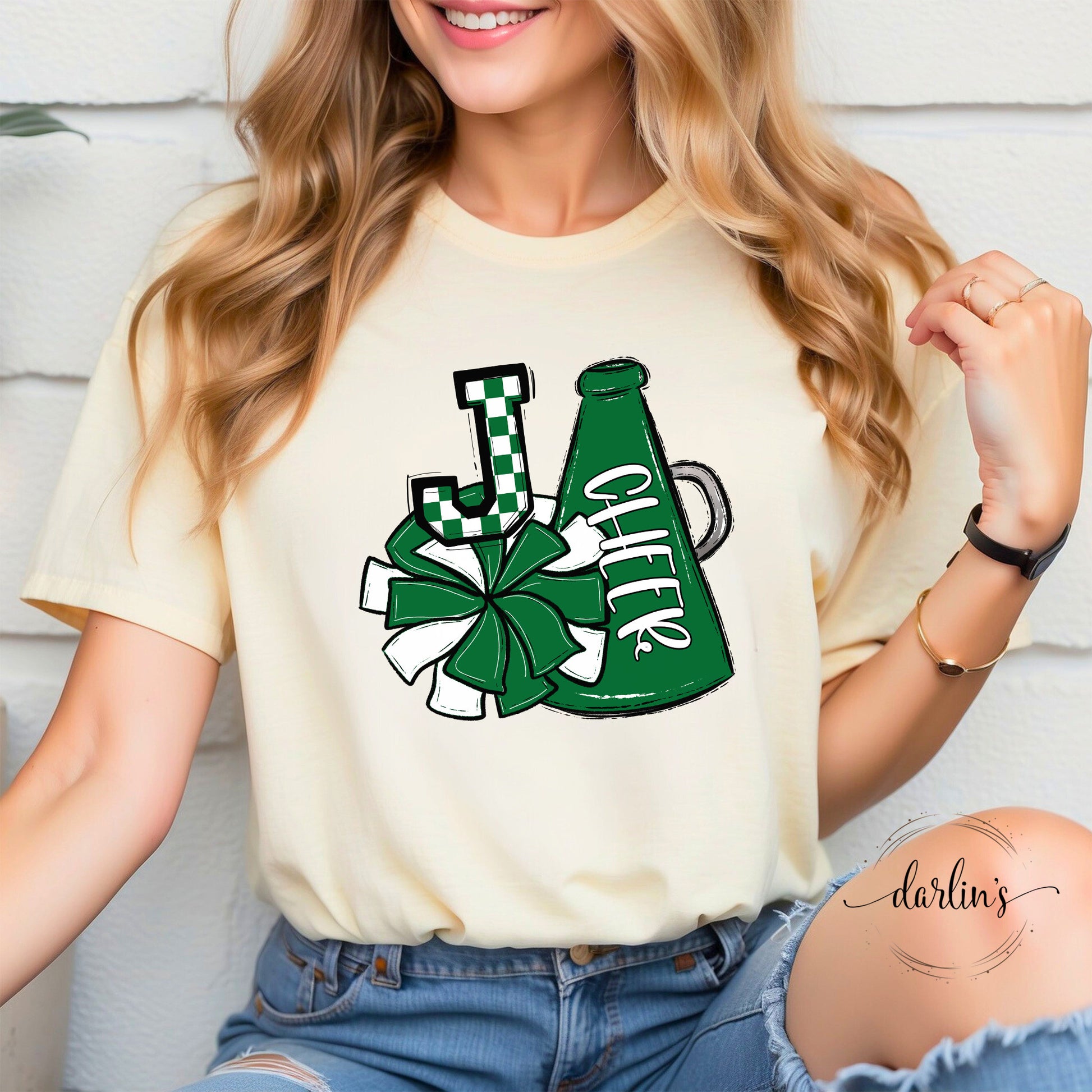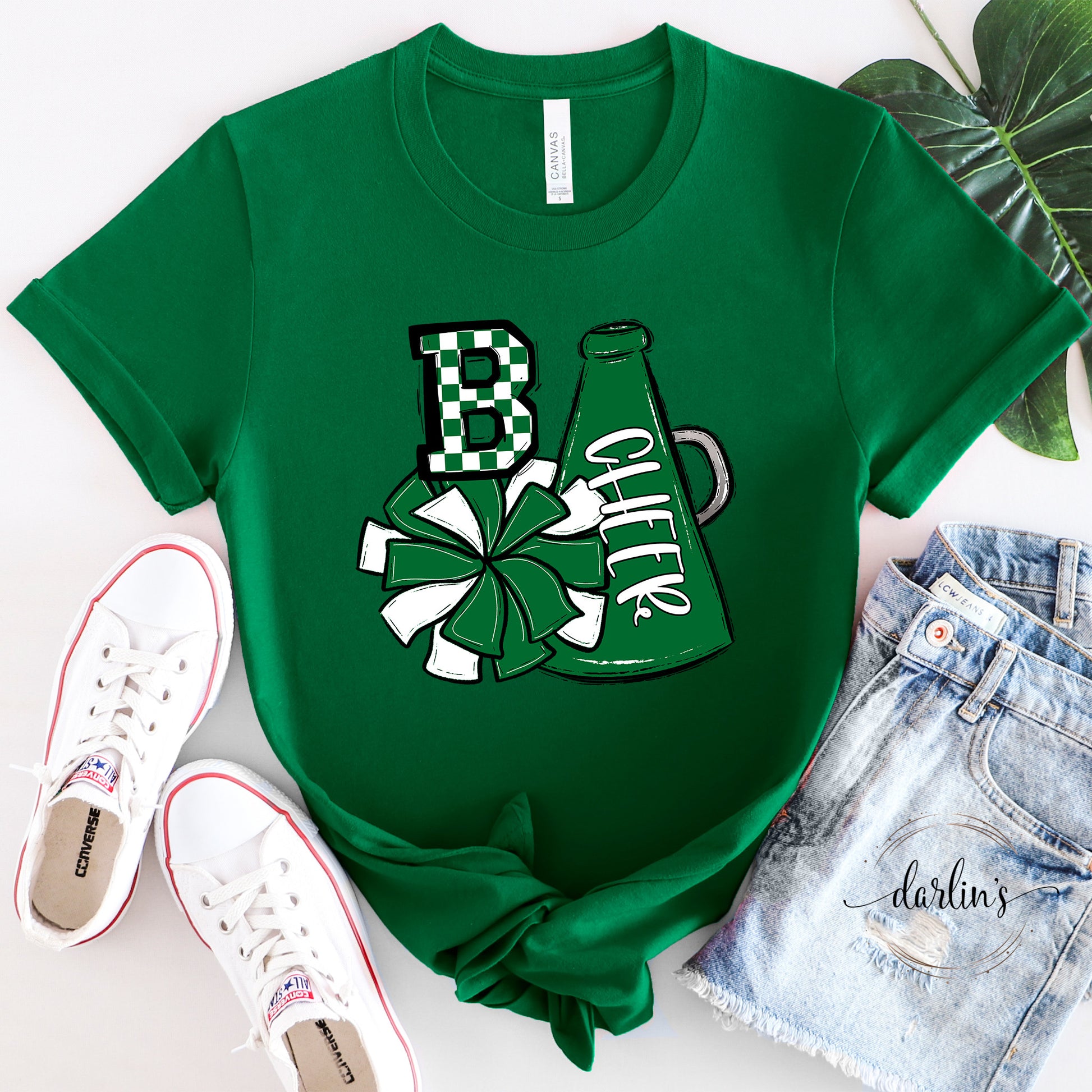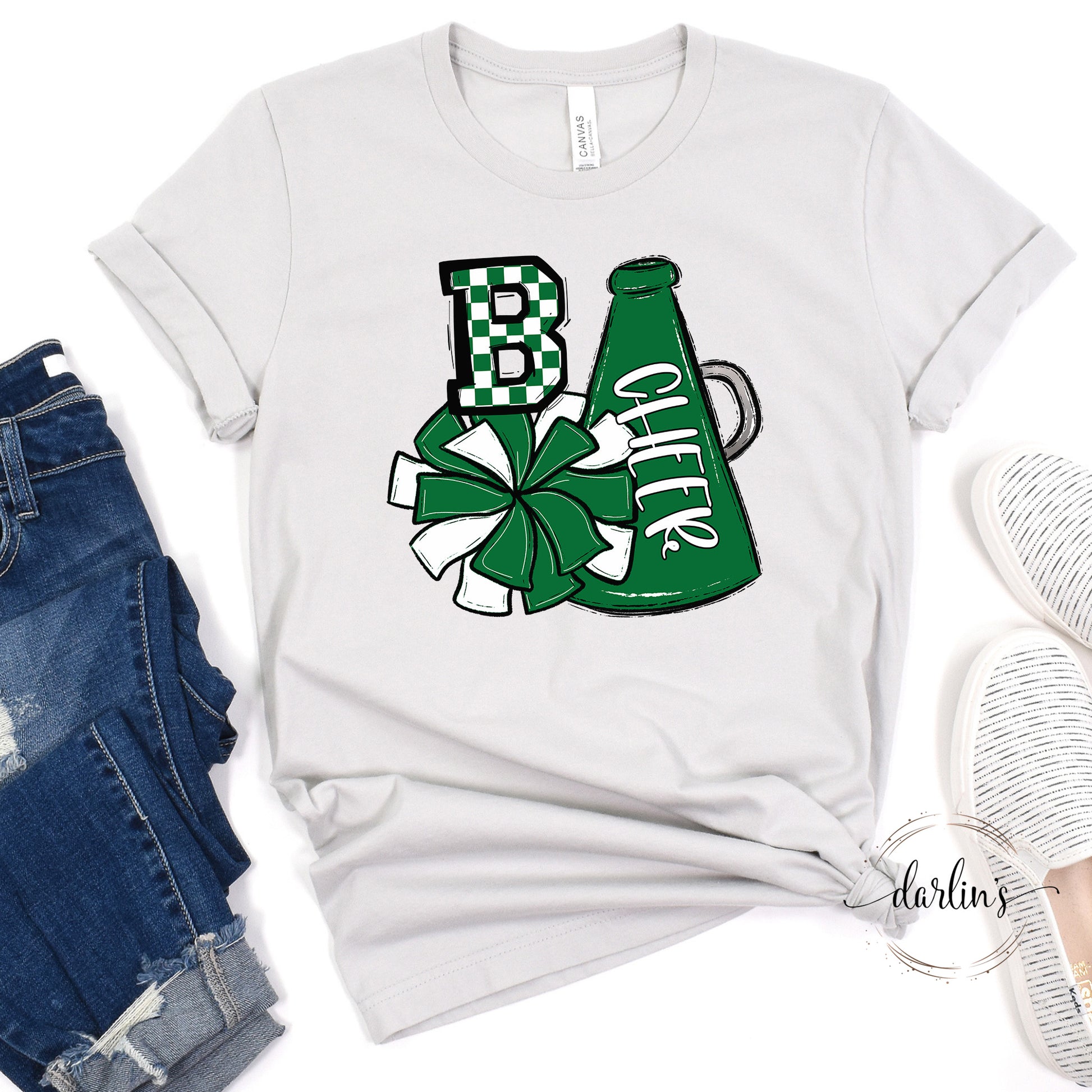 Show your spirit with this lively Kelly Green Pom and Megaphone shirt! Ideal for boosting energy and bringing excitement to any gathering. Personalize it with your chosen letter—whether it’s your mascot, school, favorite cheerleader or player’s initial—for a fun, custom touch.