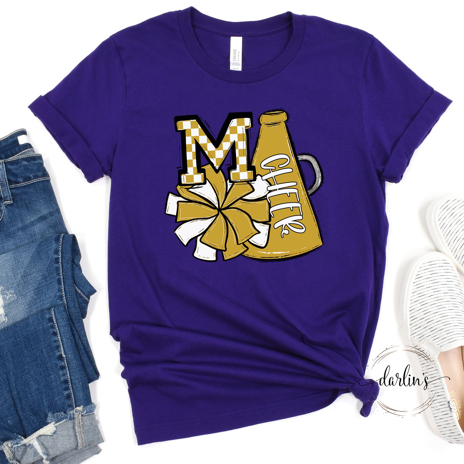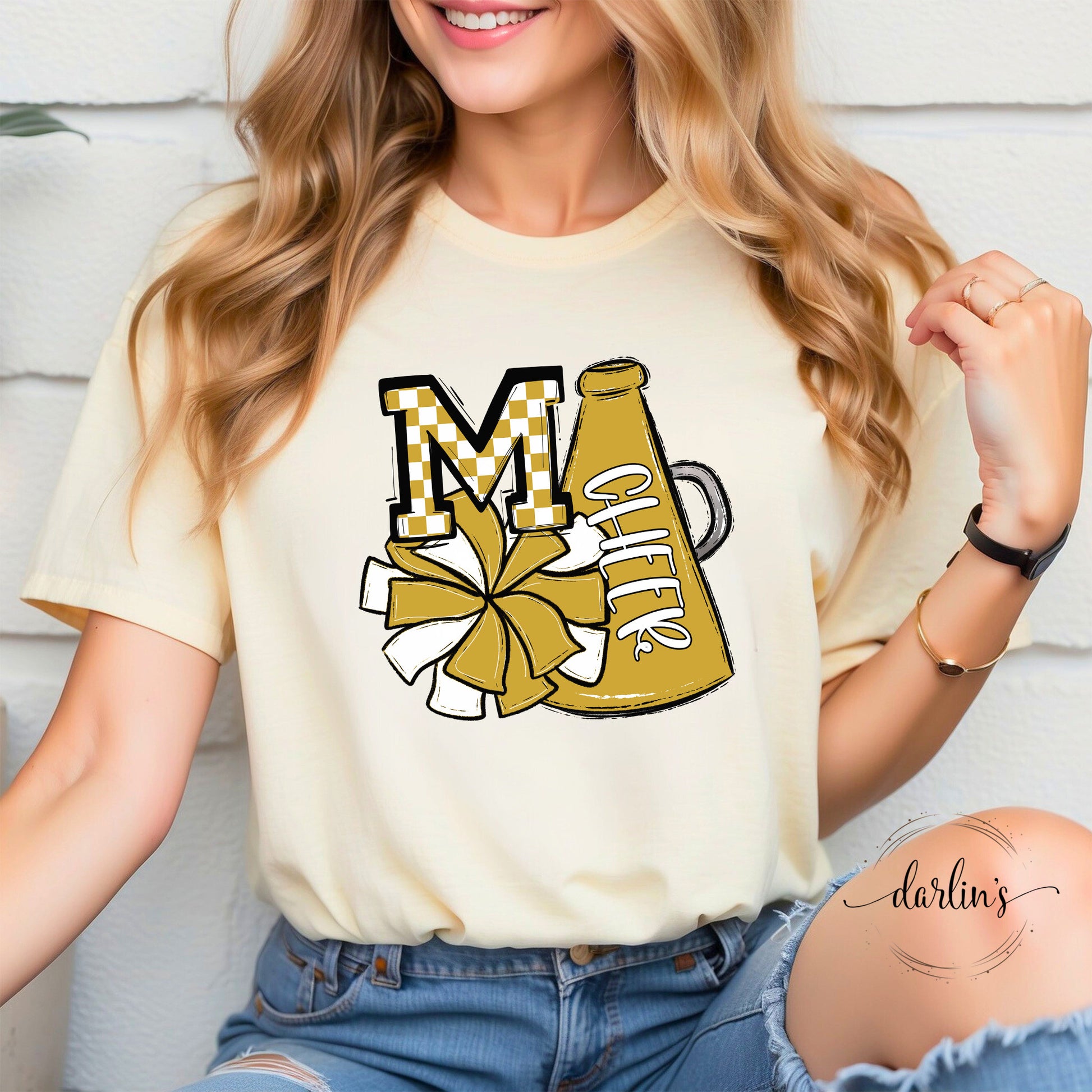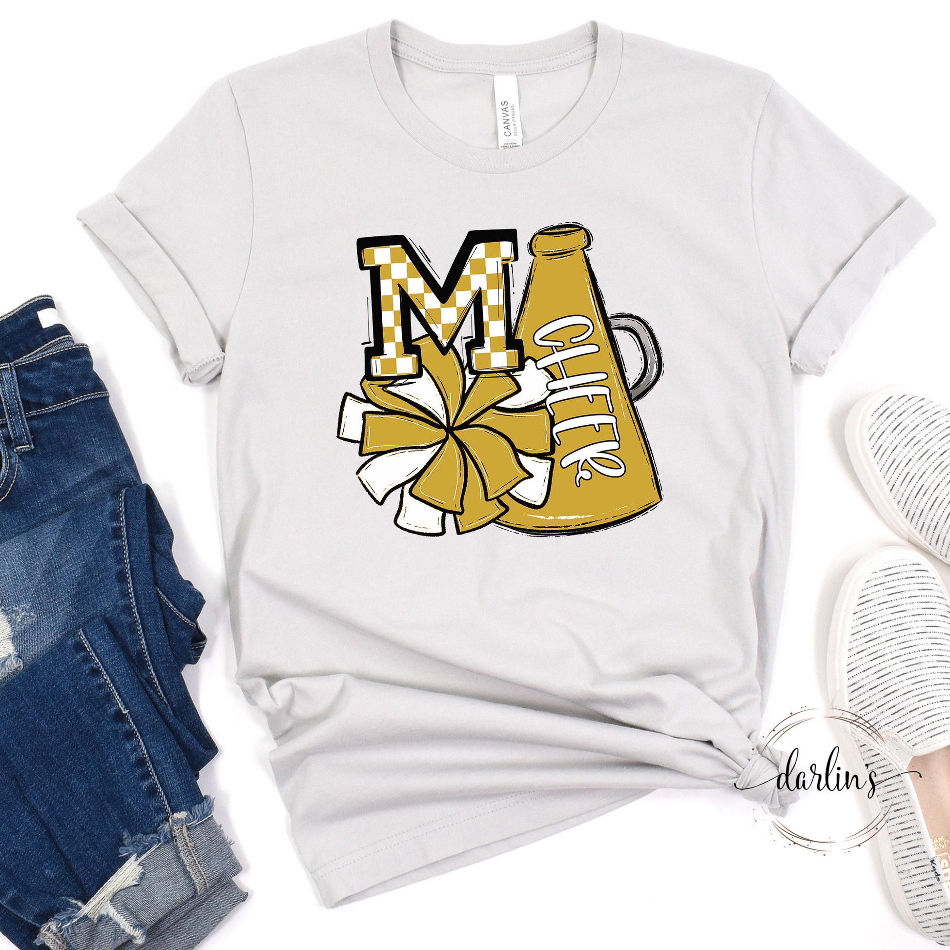 Show your spirit with this lively Vegas gold Pom and Megaphone shirt! Ideal for boosting energy and bringing excitement to any gathering. Personalize it with your chosen letter—whether it’s your mascot, school, favorite cheerleader or player’s initial—for a fun, custom touch.