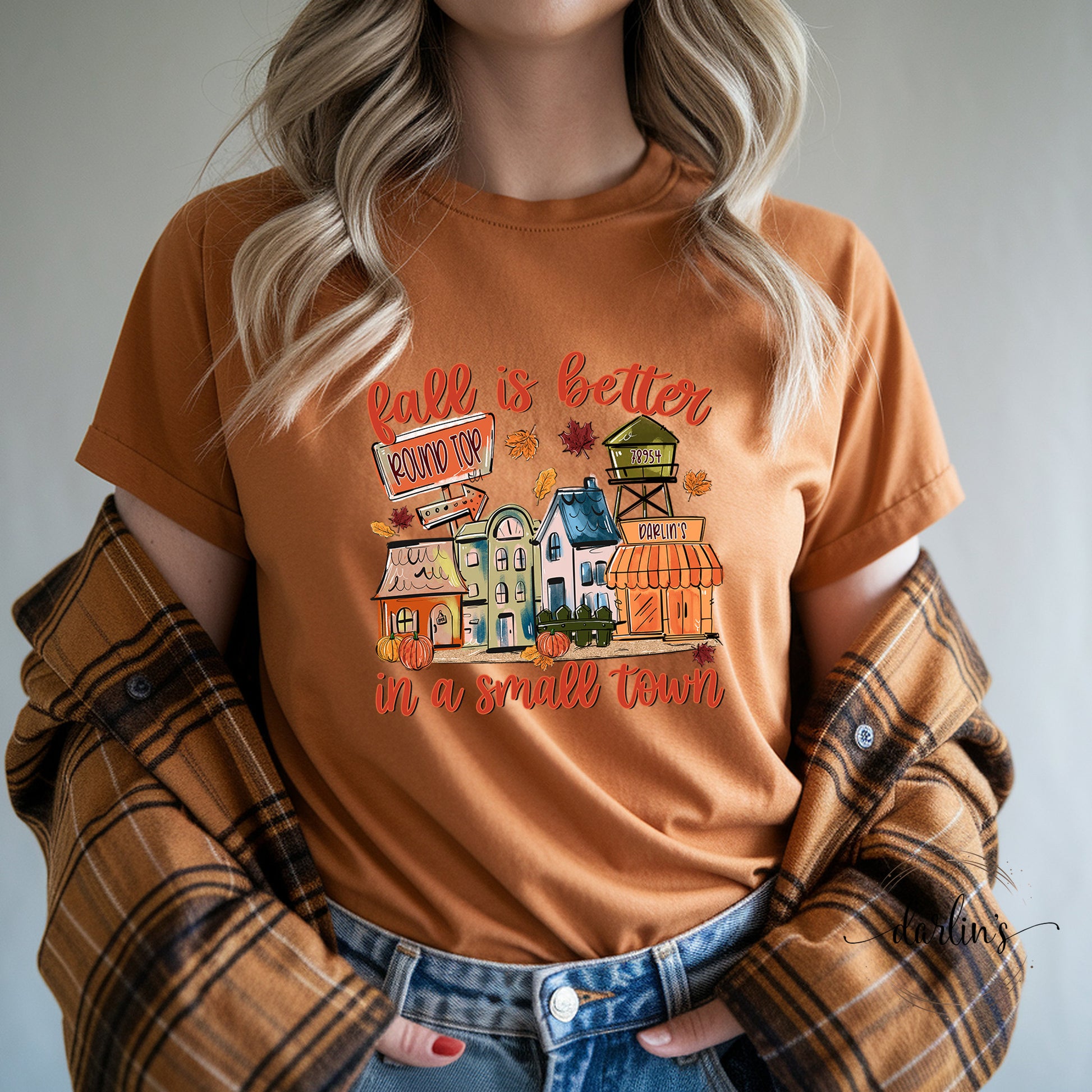 Show off your holiday spirit with our Fall Is Better In A Small Town Darlins Round Top Shirt! Great for gifting or just keeping all to yourself.