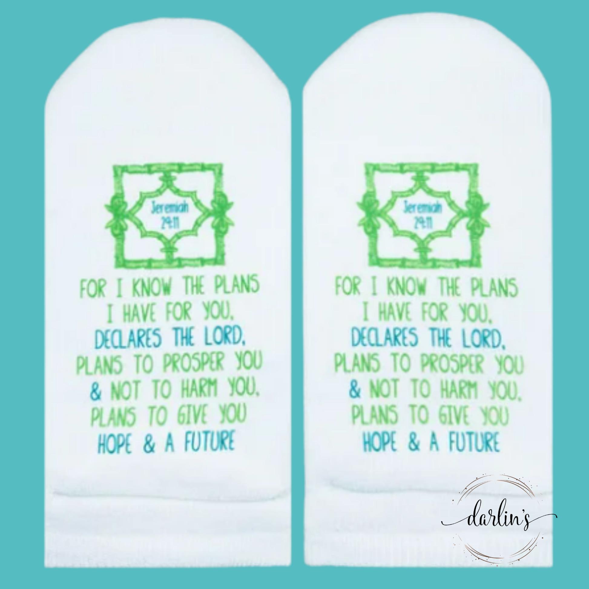 These refined socks feature the hopeful verse from Jeremiah 29:11, "For I Know The Plans I Have For You," offering a comforting reminder of purpose and divine guidance. The sophisticated design subtly incorporates this inspiring scripture, making these socks a meaningful accessory for those who value both elegance and spiritual encouragement. Perfect as a thoughtful gift or a personal symbol of faith and optimism, they blend timeless style with heartfelt inspiration.
