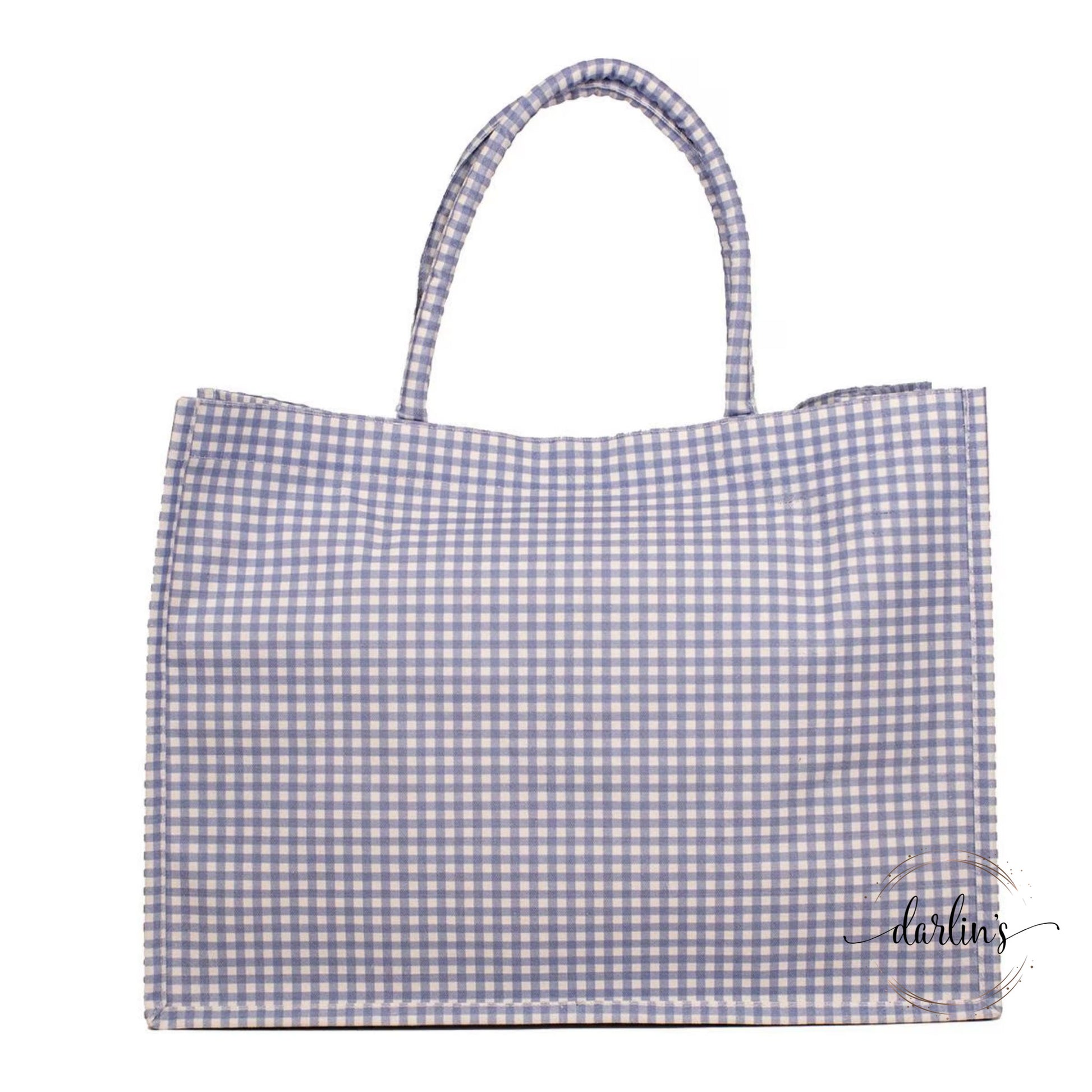 The Gingham Classic Tote in White/Blue is a stylish and practical accessory measuring 19x14x7.5 inches. With its timeless gingham pattern and spacious interior, it's perfect for carrying your essentials in style.