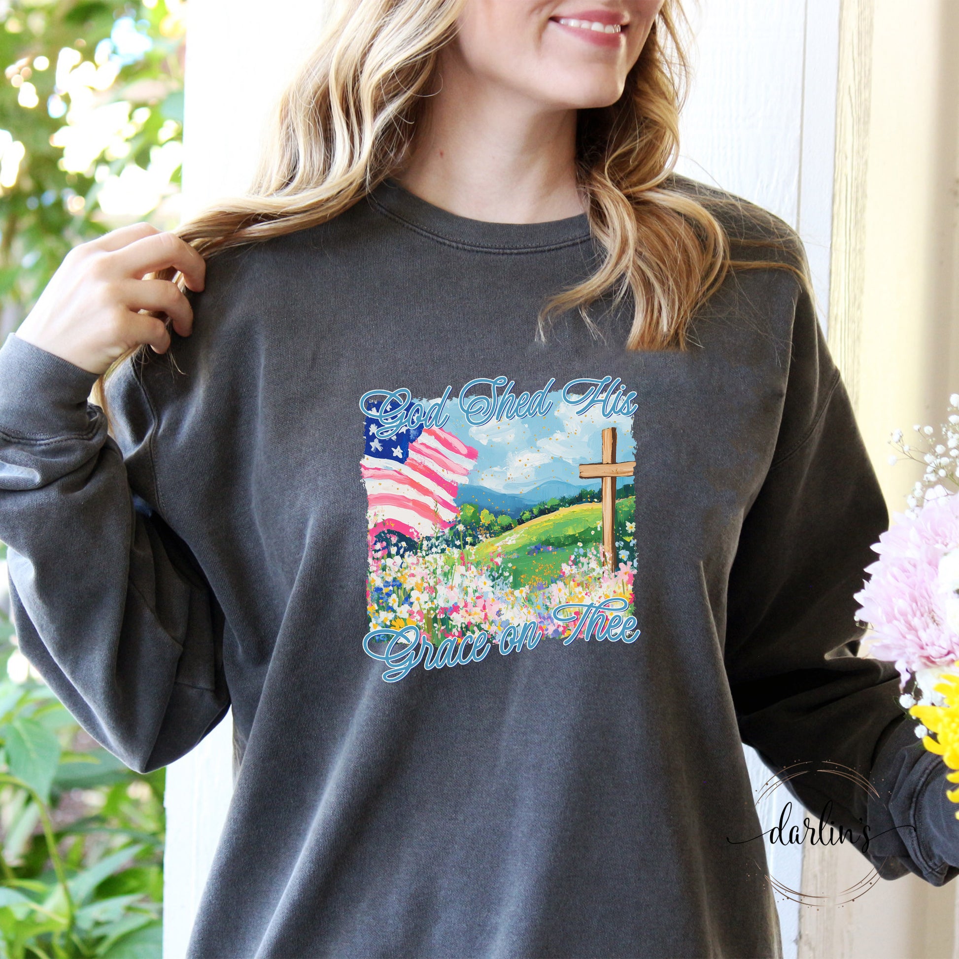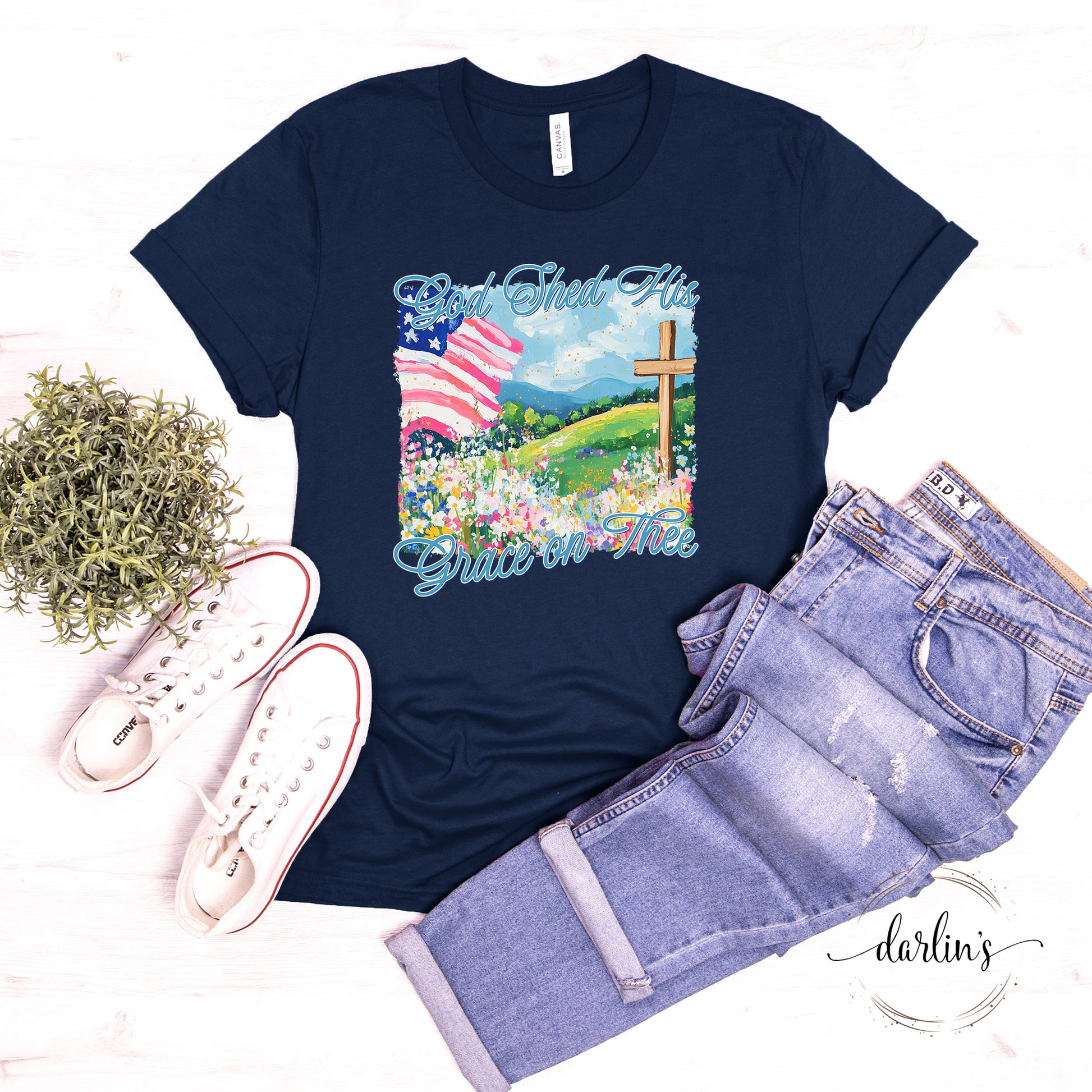 Show off your patriotic pride with this playful "God Shed His Grace On Thee" design, perfect for celebrating the spirit of America with a touch of fun!