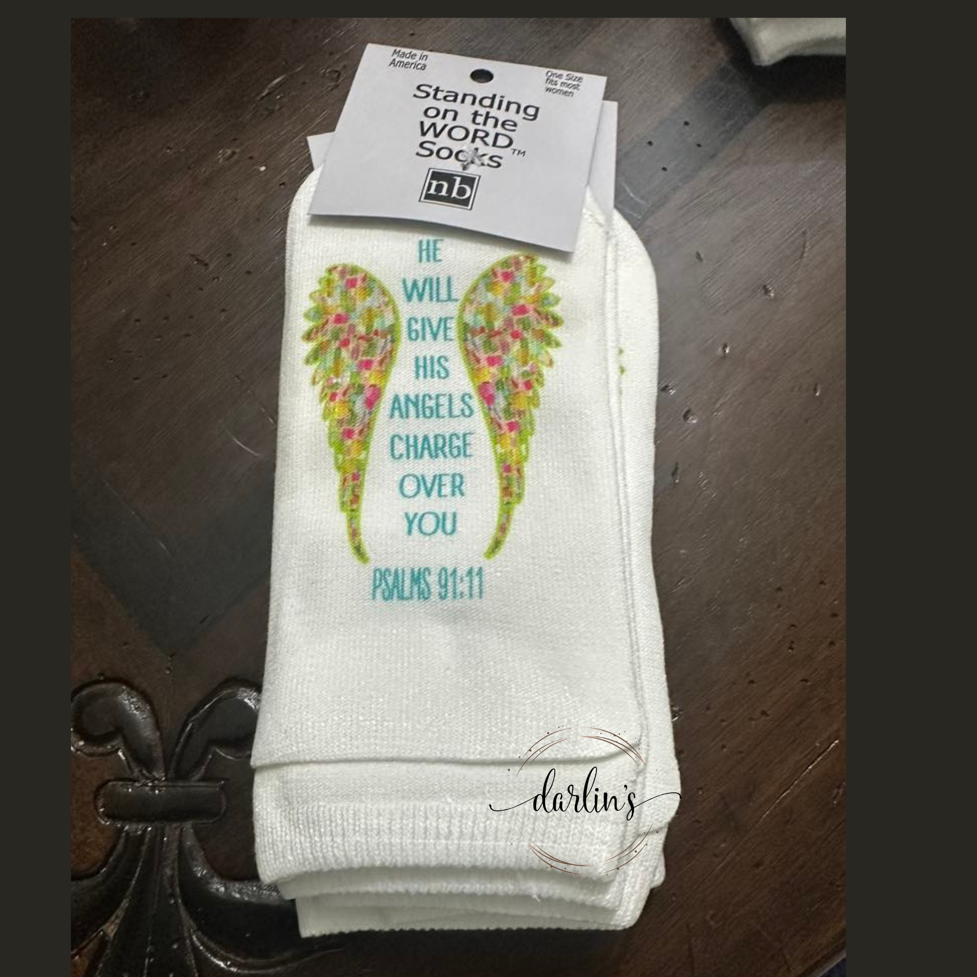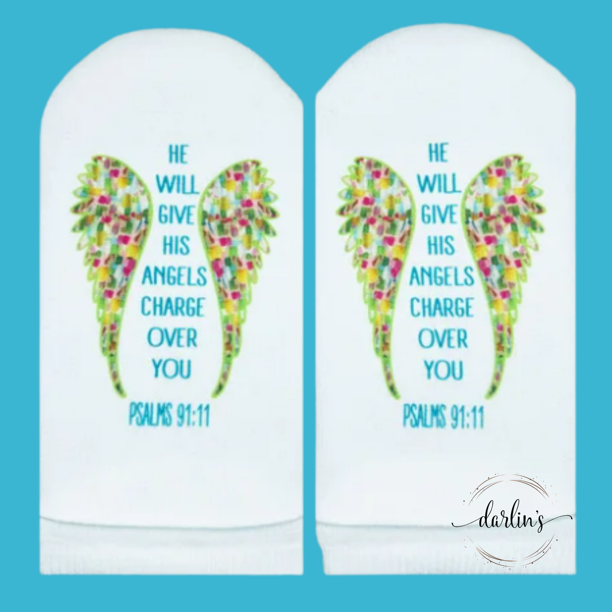 These refined socks feature the comforting scripture from Psalms 91:11, "He Will Give His Angels Charge Over You," offering a subtle yet powerful reminder of divine protection. Designed with premium materials for lasting comfort and durability, they combine thoughtful inspiration with everyday practicality. Ideal for those seeking a meaningful accessory that blends faith and elegance, these socks make a graceful gift or a personal token of reassurance and strength.