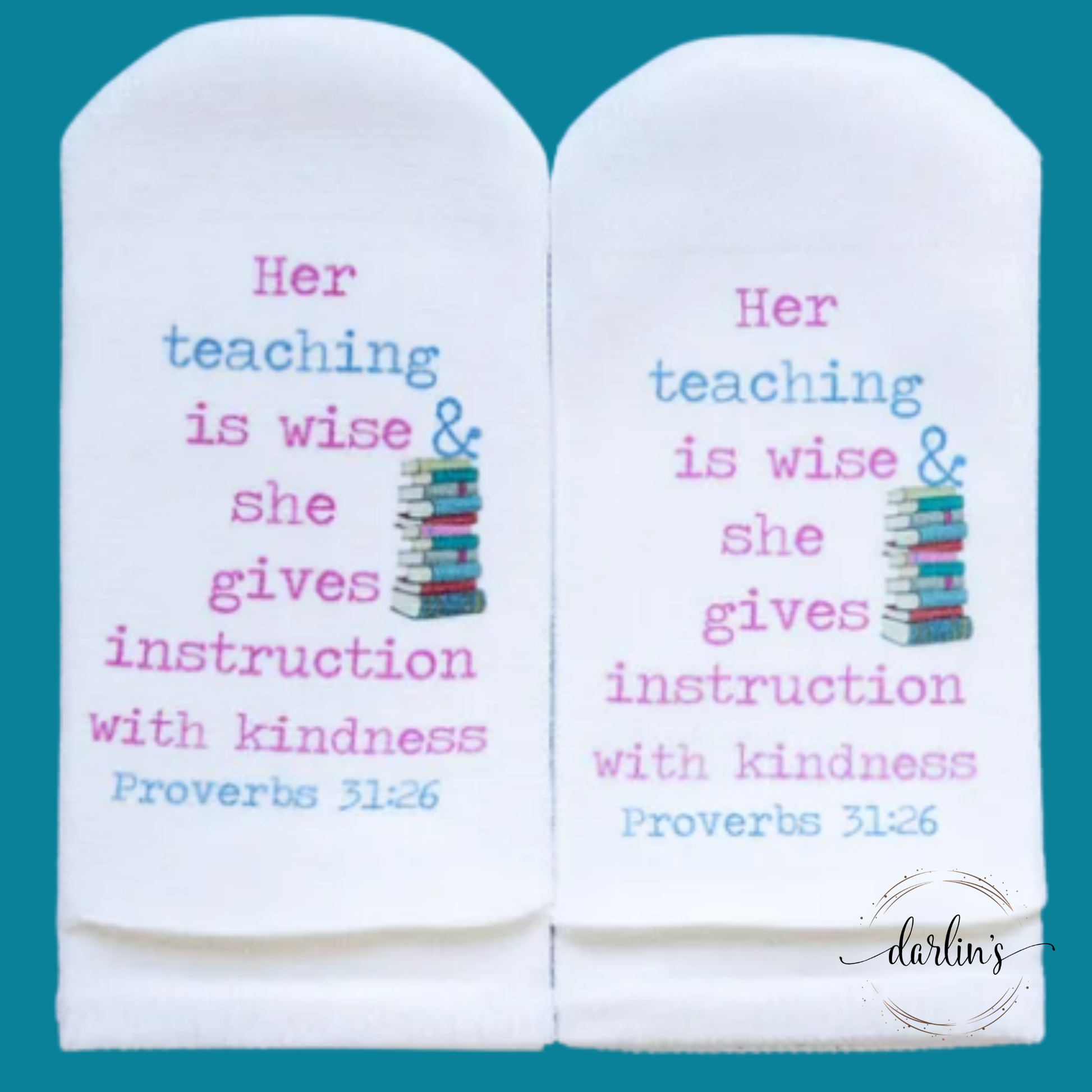 These sophisticated socks showcase the empowering verse from Proverbs 31:26, "Her Teaching Is Wise," celebrating wisdom and grace. The elegant design subtly integrates this inspiring message, making these socks a perfect accessory for those who value both style and meaningful expression. Whether as a thoughtful gift or a personal reminder of strength and insight, they embody timeless elegance and encouragement.