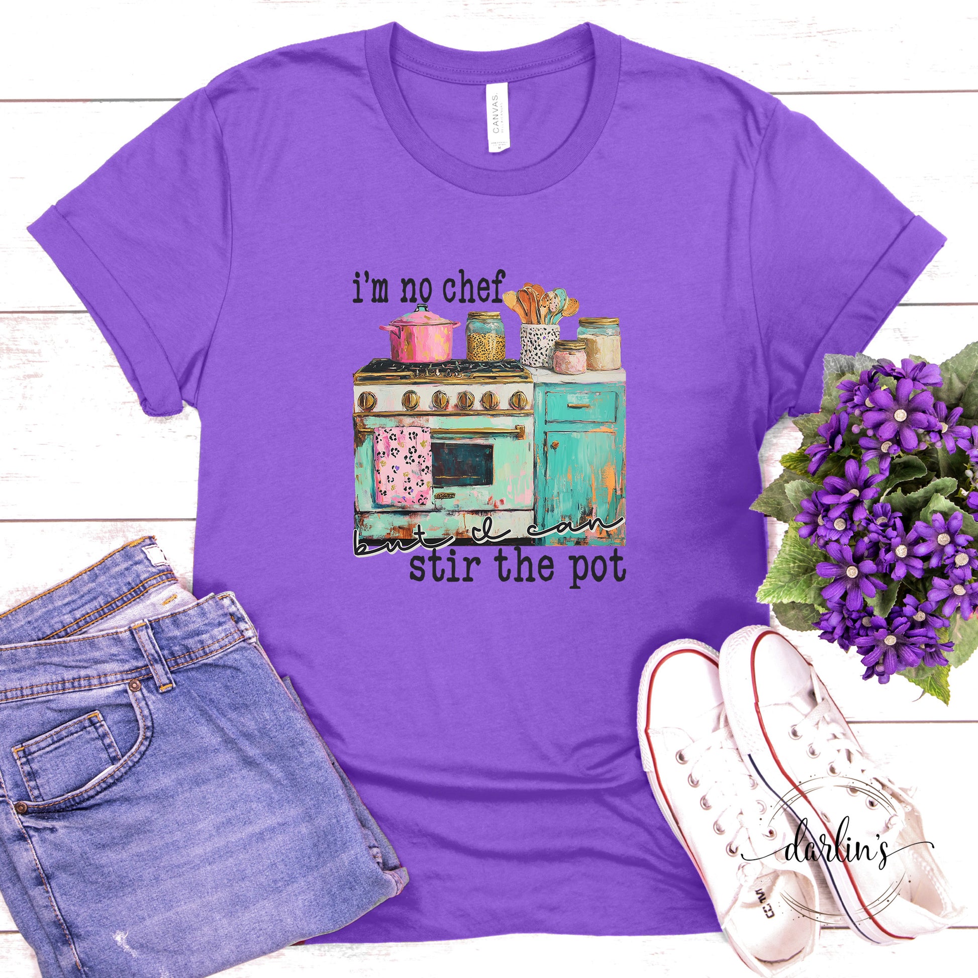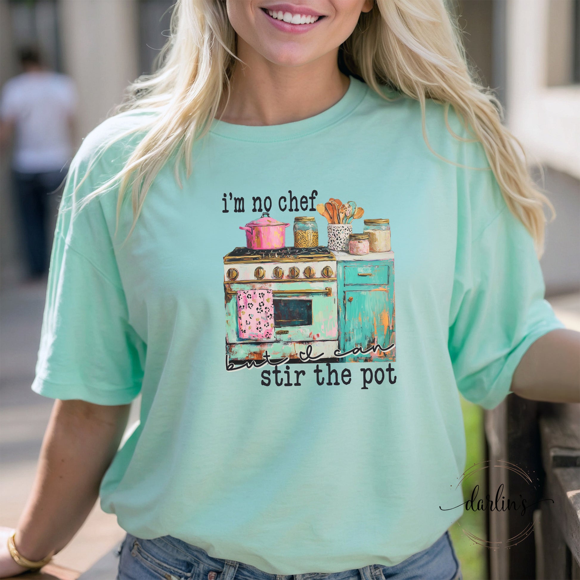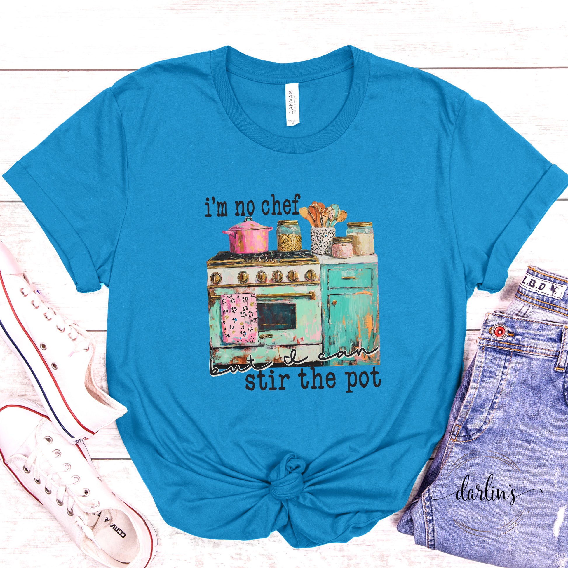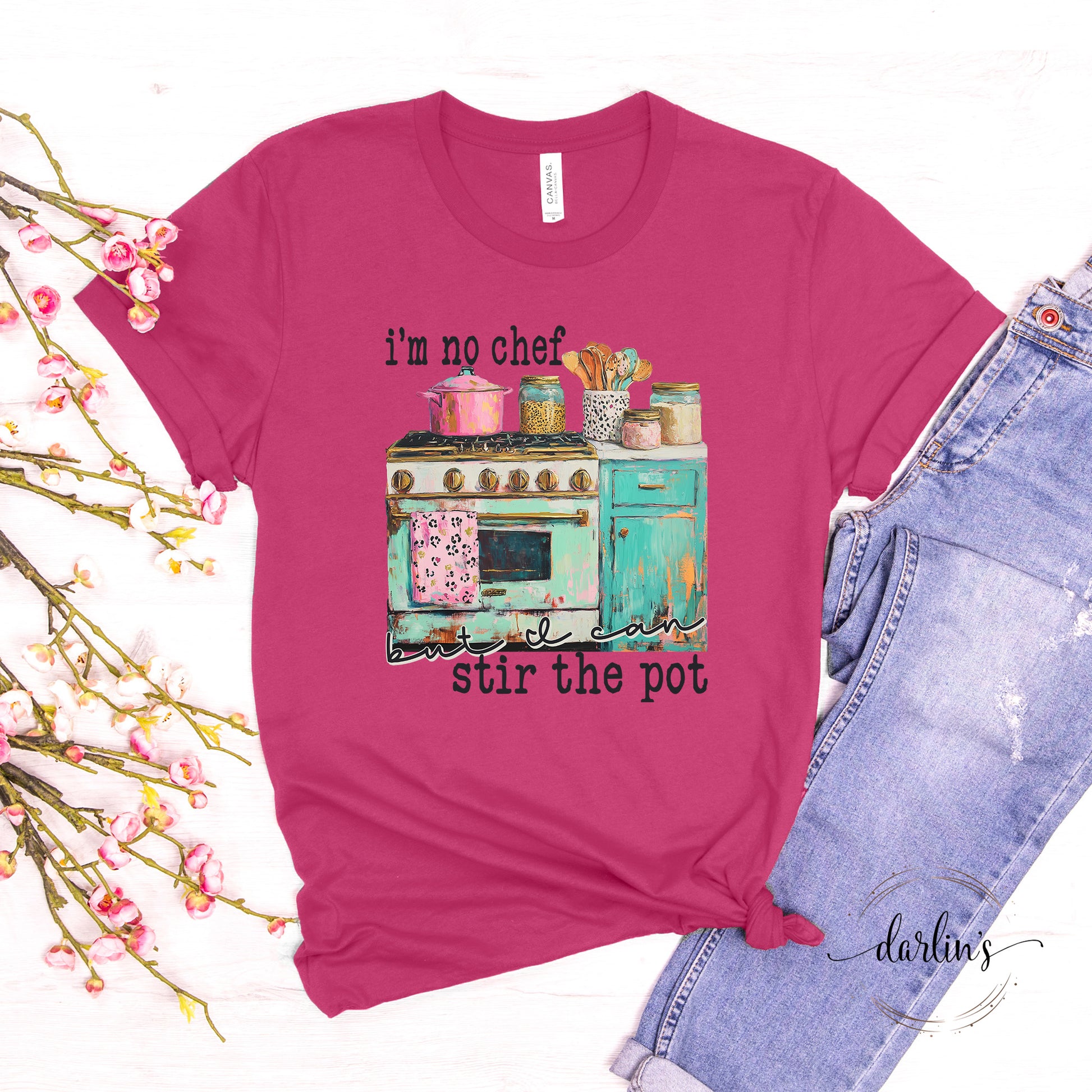 Show off your playful side with the "I'm No Chef But I Can Stir The Pot" graphic top. Perfect for those who love to add a little fun to their kitchen adventures, this top combines comfort with a cheeky message. Whether you're cooking up a storm or just stirring the conversation, it’s a lighthearted way to express your culinary confidence without taking yourself too seriously. Made for casual wear, it’s an ideal choice for relaxed days at home or casual outings where a bit of humor goes a long way. Embrace your inner kitchen mischief with this charming graphic top!