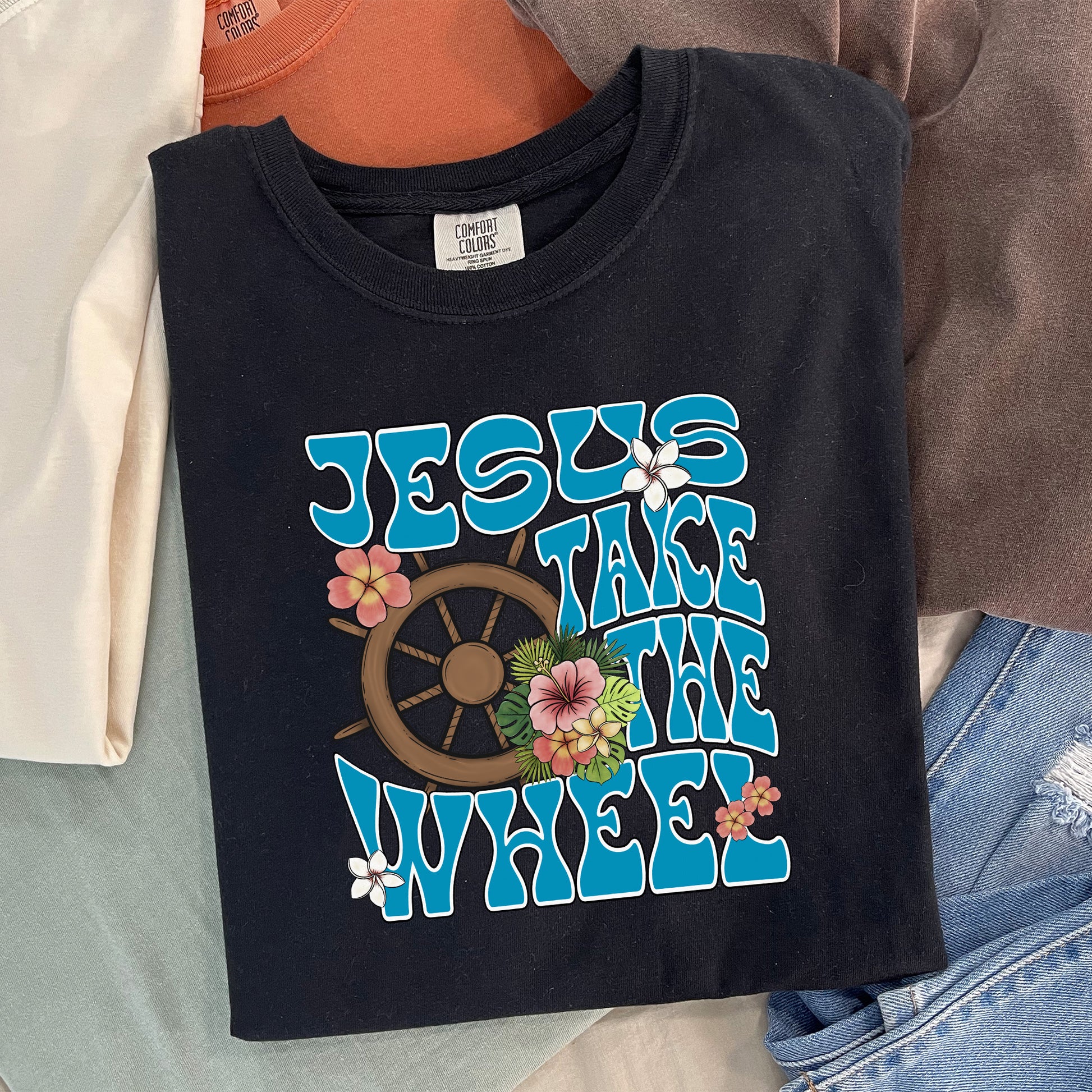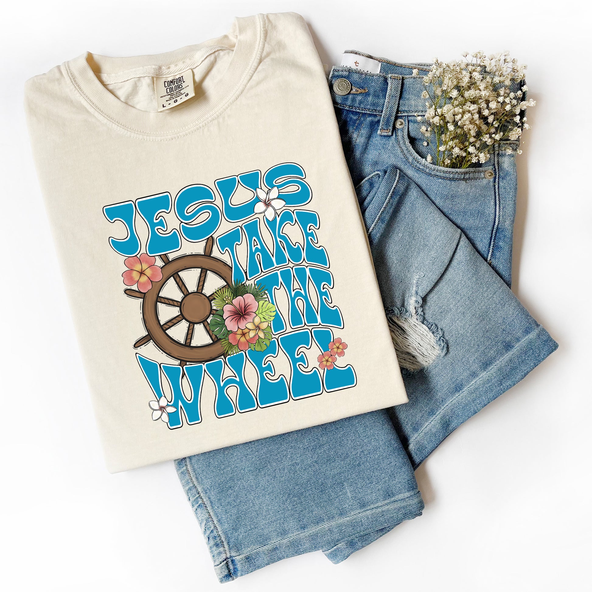 Let go and let Jesus steer the ship! This playful nautical twist on "Jesus Take The Wheel" brings a fun, sea-inspired vibe to your faith. Perfect for those who love a splash of humor with their devotion.