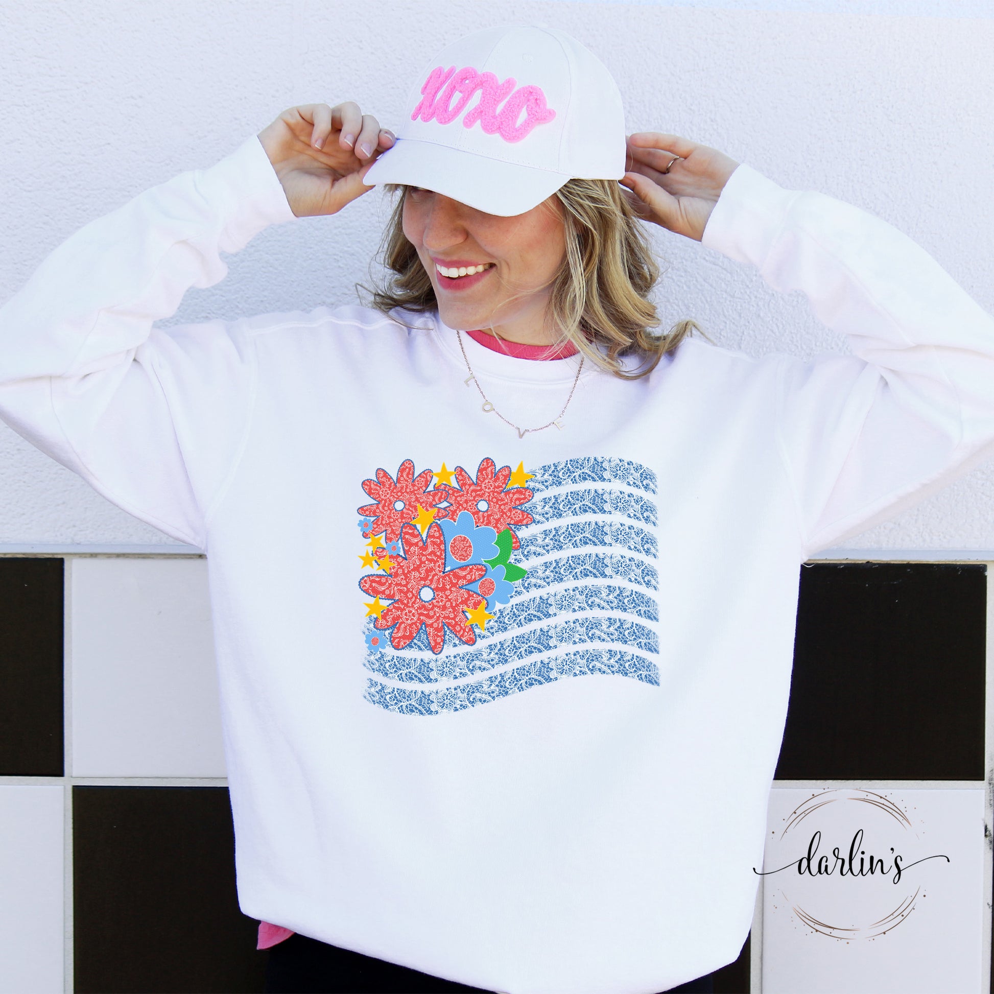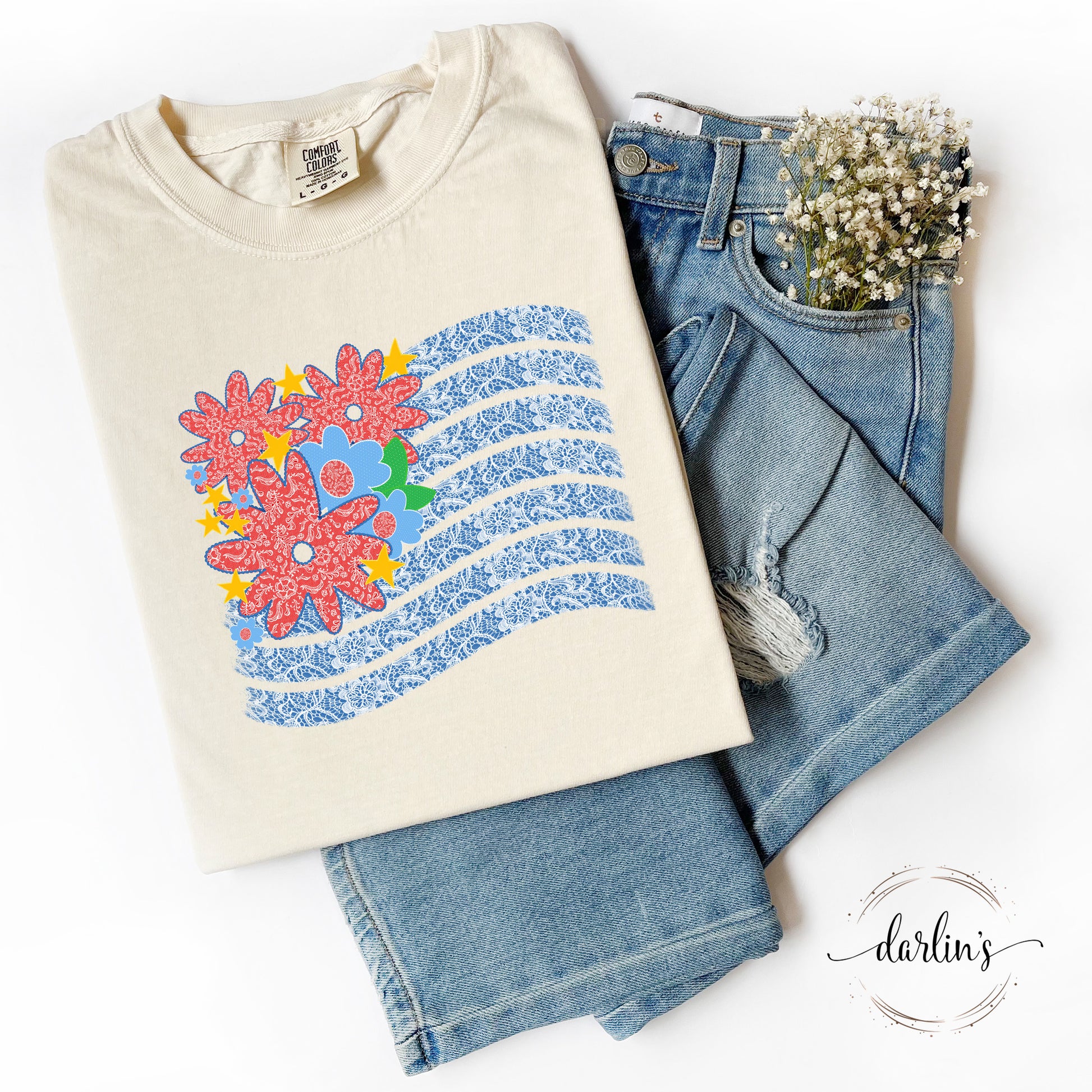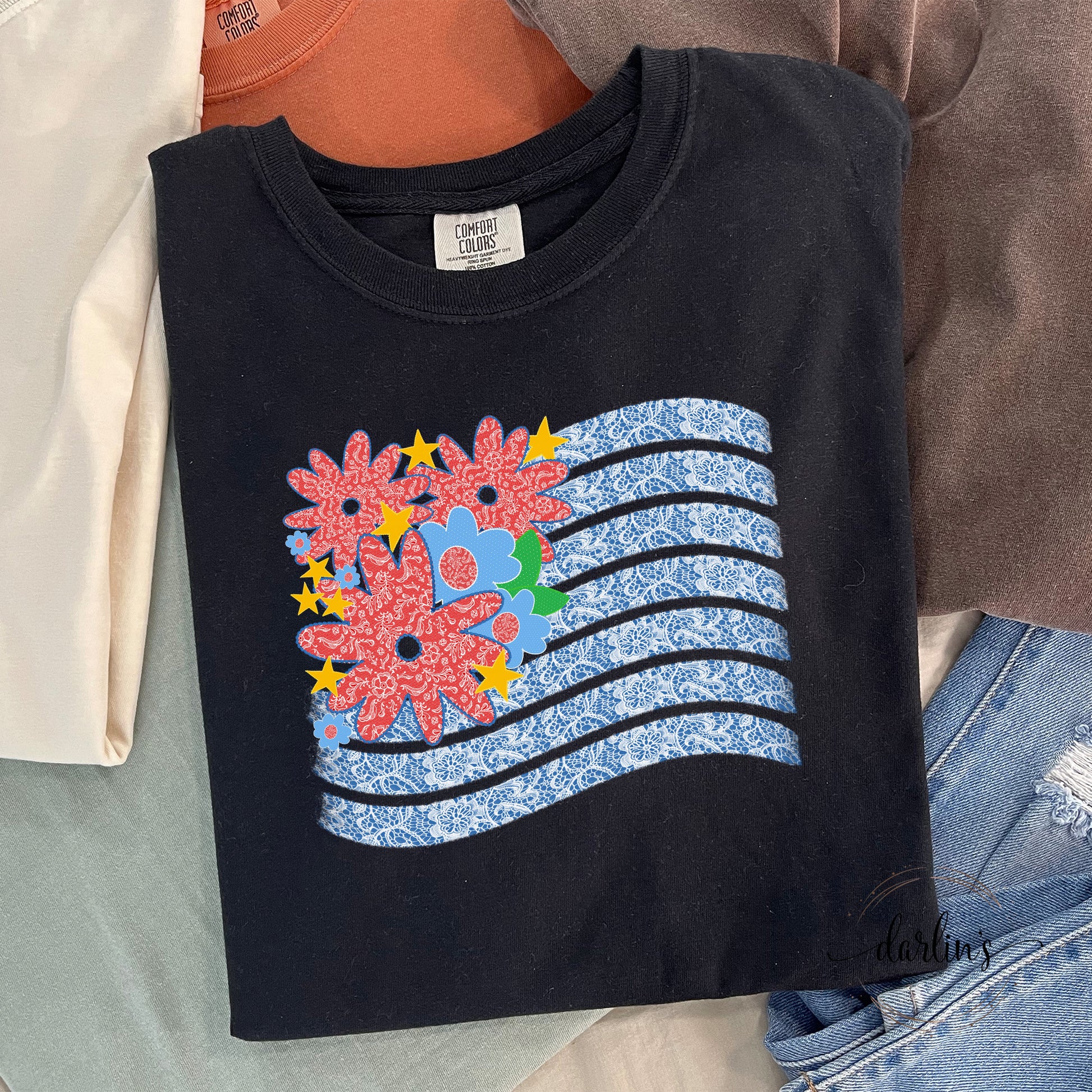 Show off your patriotic spirit in style with this playful Lace American Flag shirt, perfect for adding a fun and flirty touch to your wardrobe.