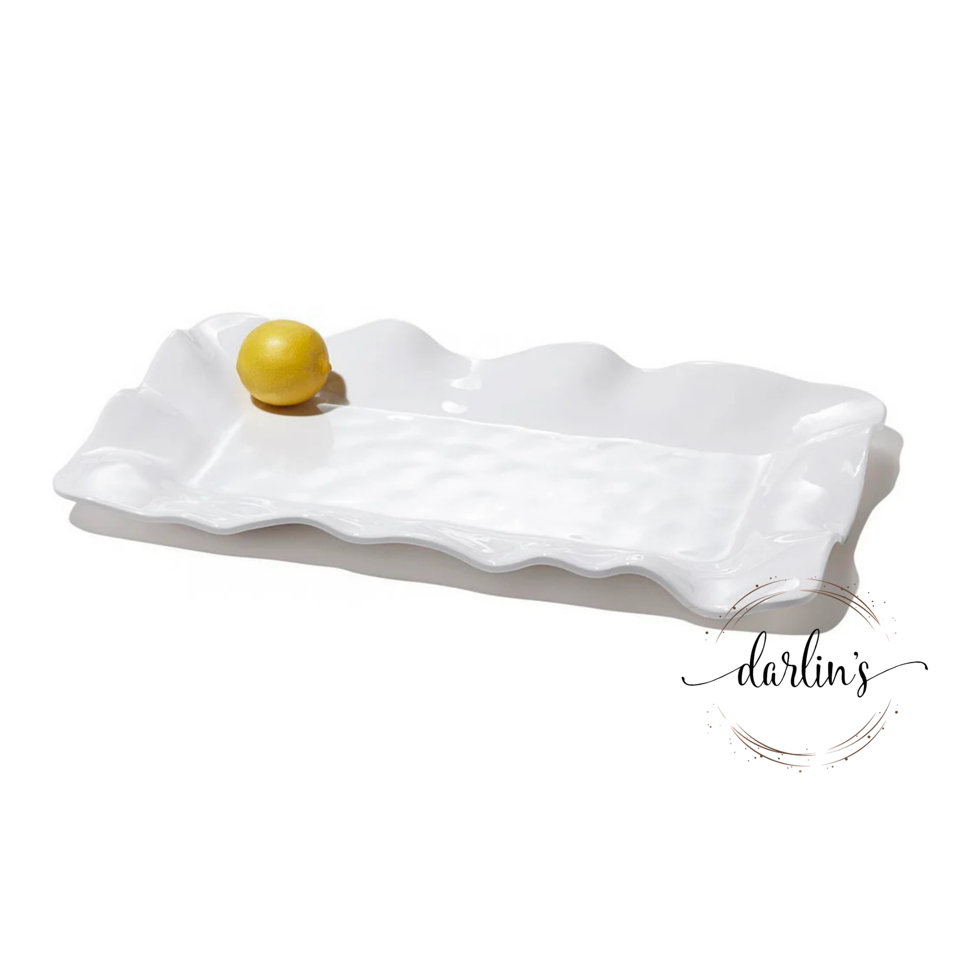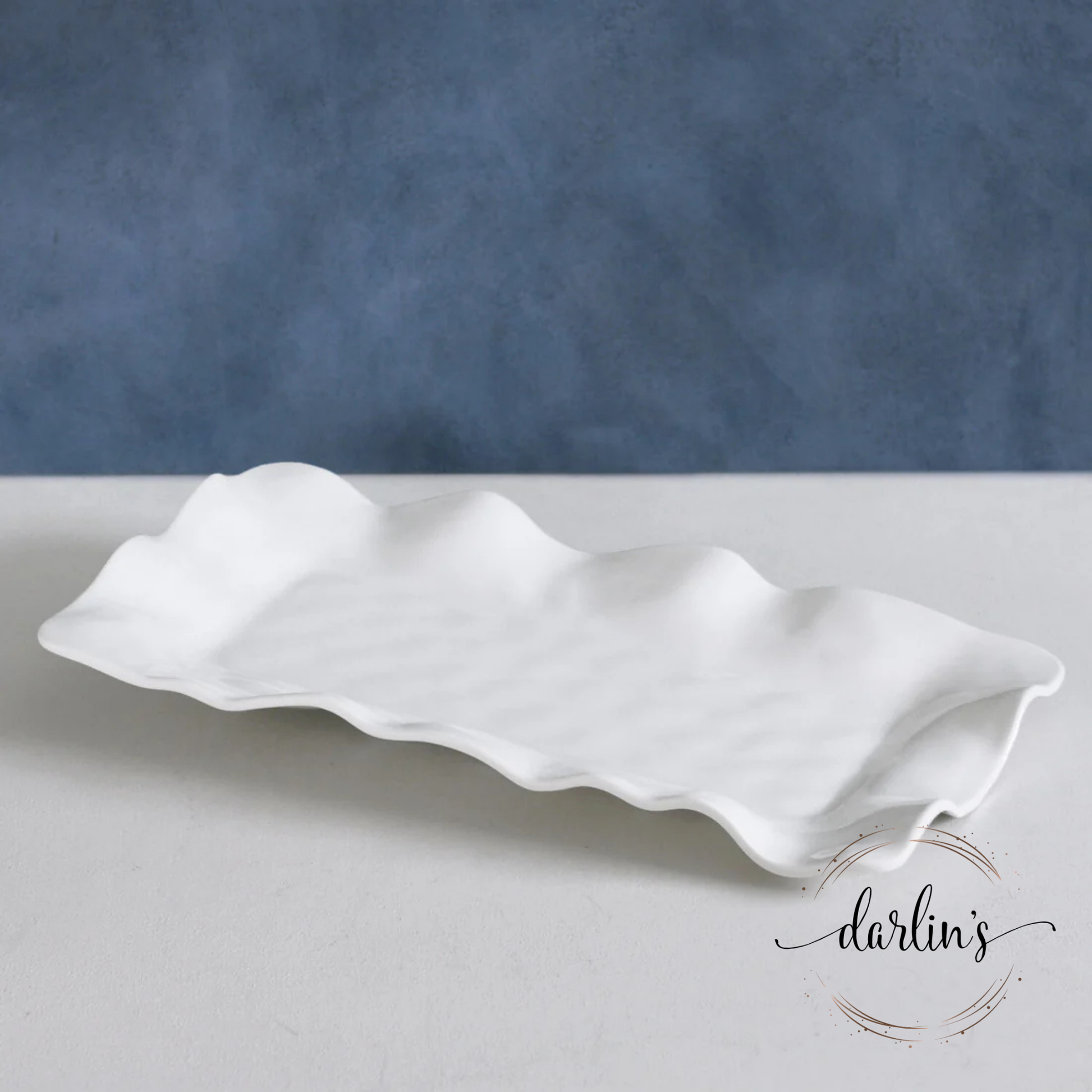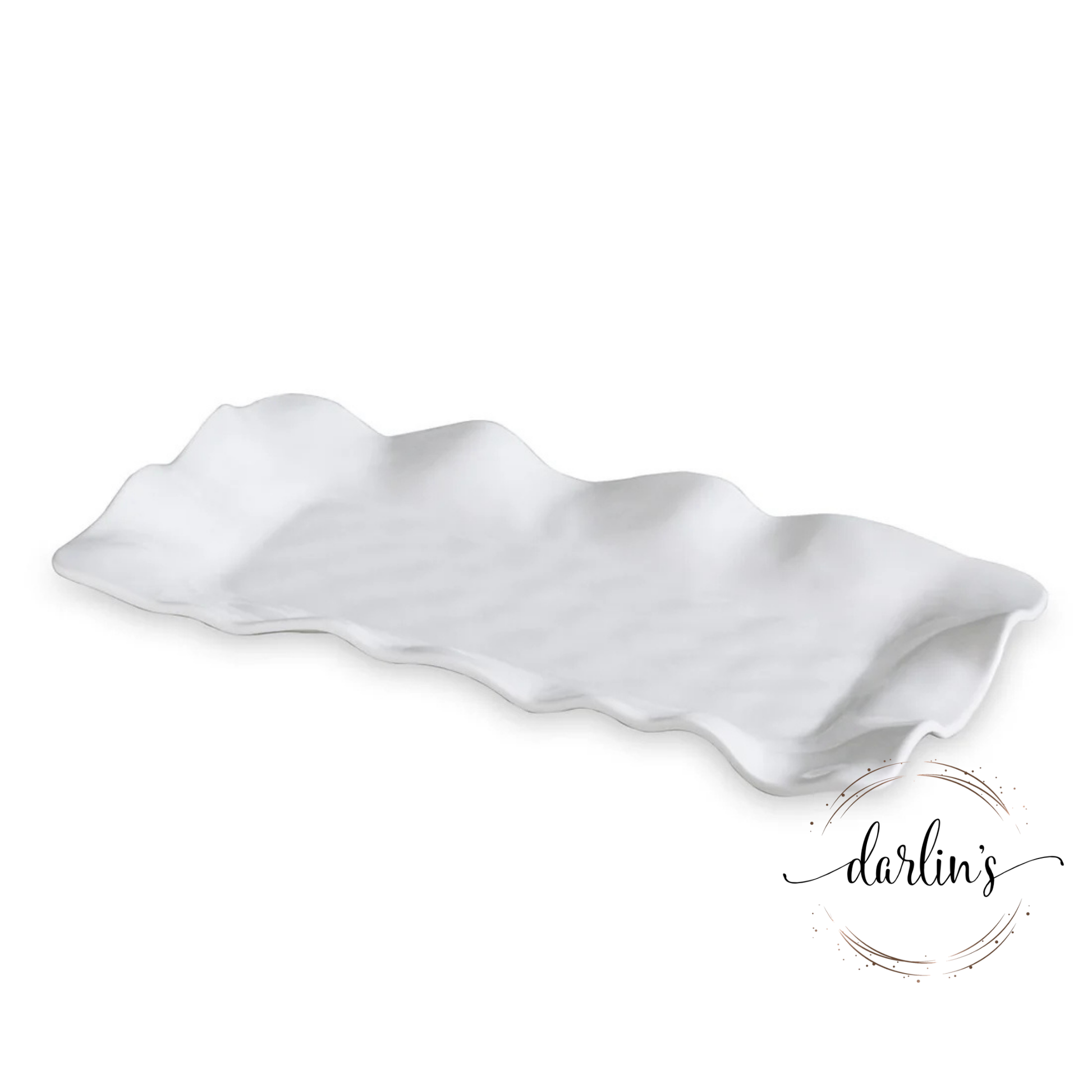 Our VIDA Havana Long Rectangular Tray (White) showcases elegant curves and a luxurious white finish, embodying distinctive design style in premium melamine. Resembling kiln-fired ceramic in weight and texture, this durable tray is crafted for daily use, ideal for both indoor and outdoor gatherings. Perfect for presenting bread and cheeses, it pairs beautifully with other white melamine pieces to create a refined, cohesive serving ensemble and enhance your table setting.
