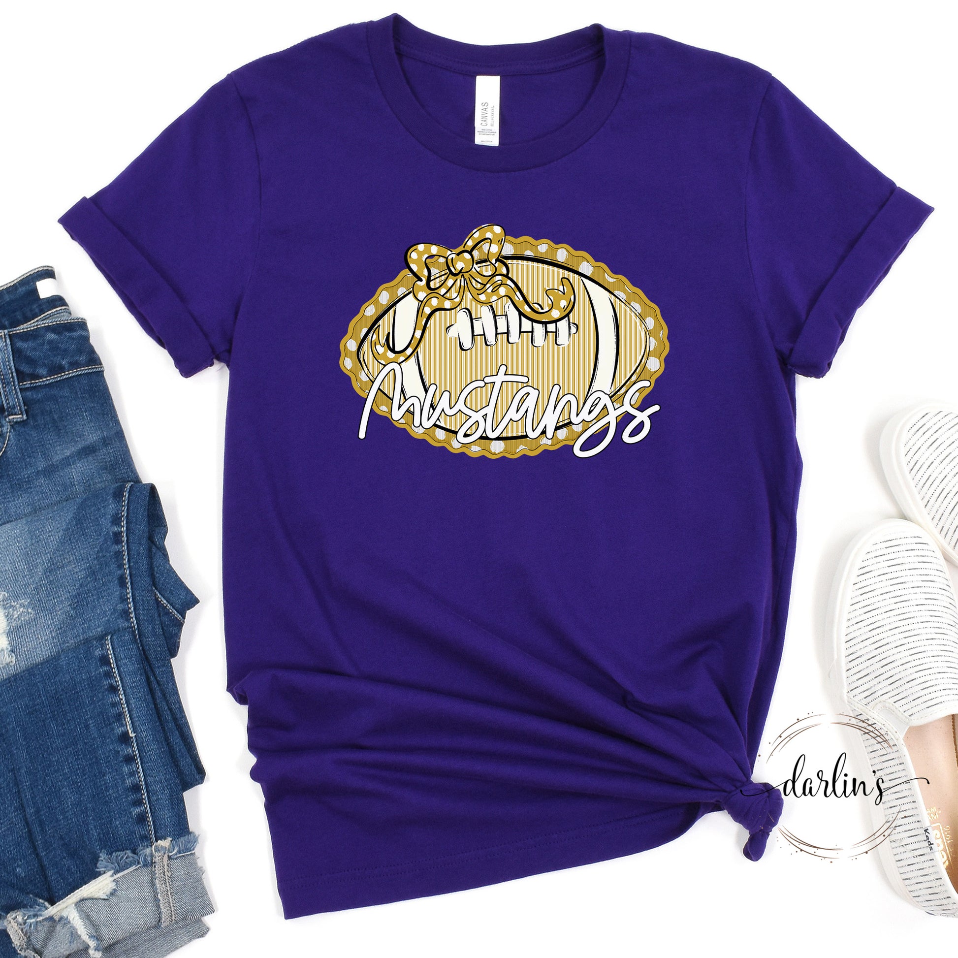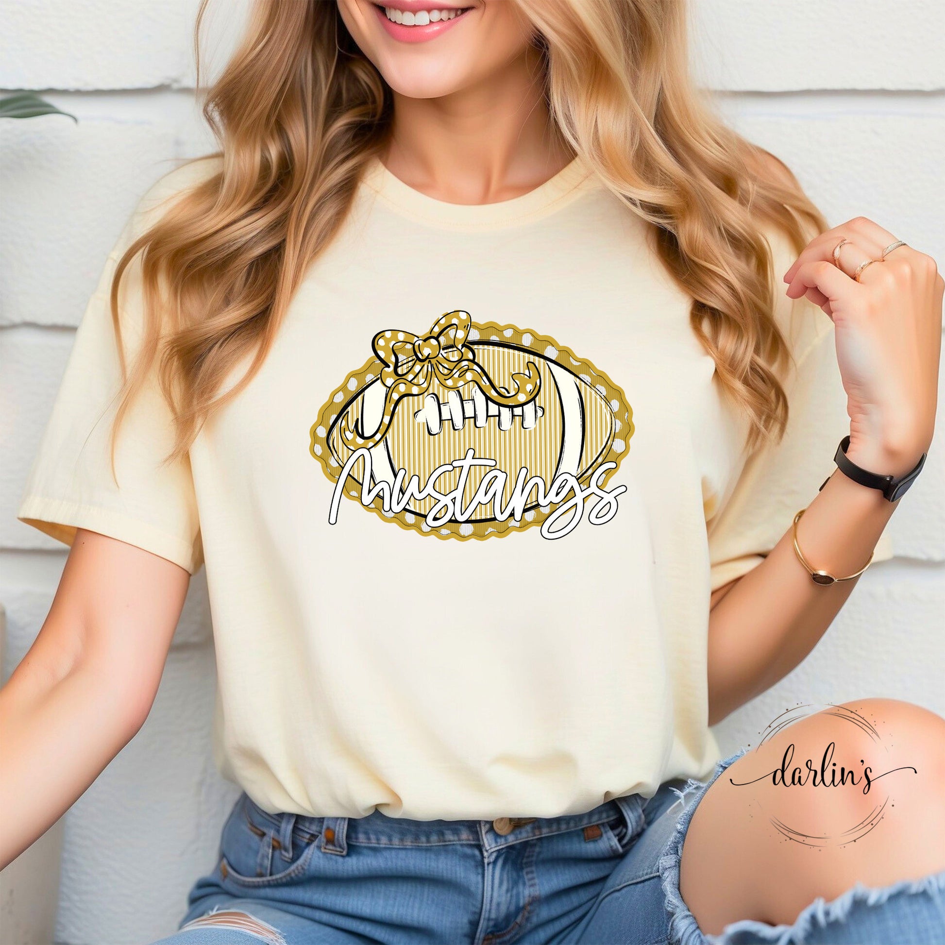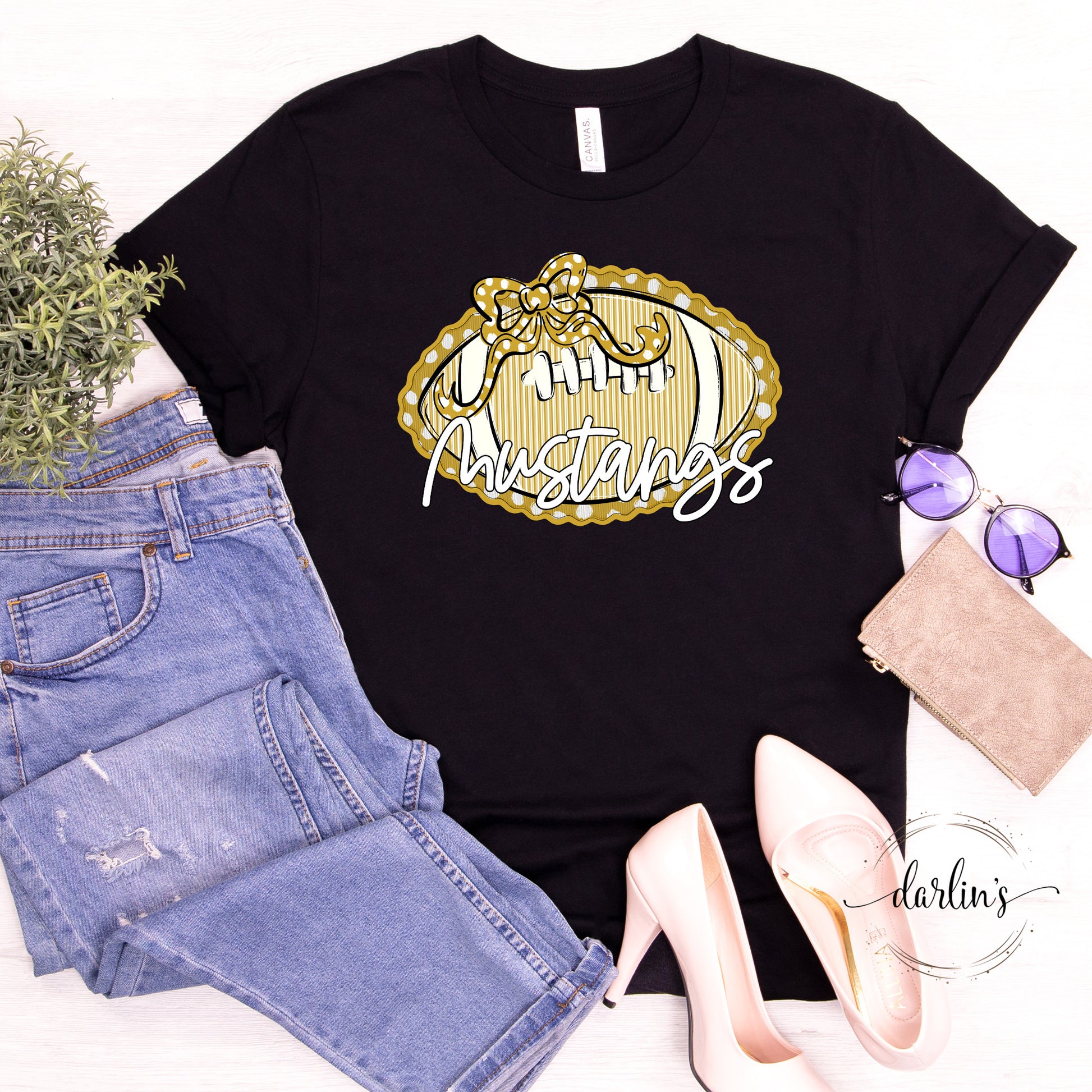 Show your Mustang spirit with the Prepster Football and Bow graphic shirt in bright gold, celebrating the Mustangs with a playful flair. This lively design combines sporty energy with a charming bow detail, making it perfect for game days or casual outings. Comfortable and eye-catching, it’s an ideal choice to stand out while supporting your favorite team with fun and enthusiasm.