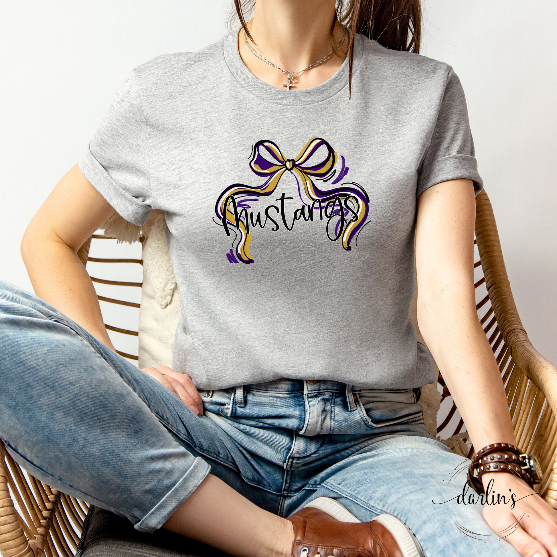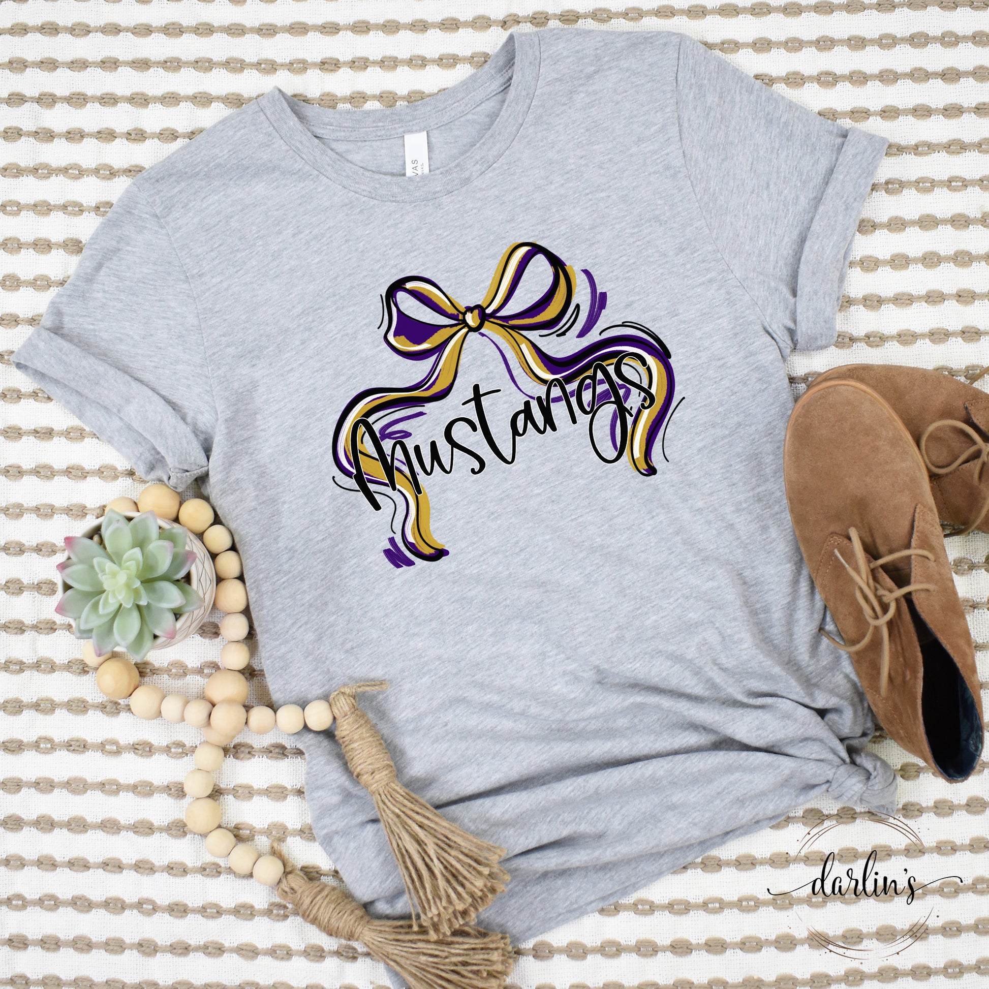 Celebrate your Mustang spirit with the Ribbon Sports Bow in vibrant purple and gold. This playful accessory adds a splash of team pride to any outfit, making it perfect for game days, pep rallies, or just showing off your colors around town. Lightweight and easy to wear, it keeps your look fun and spirited while you cheer your team to victory.