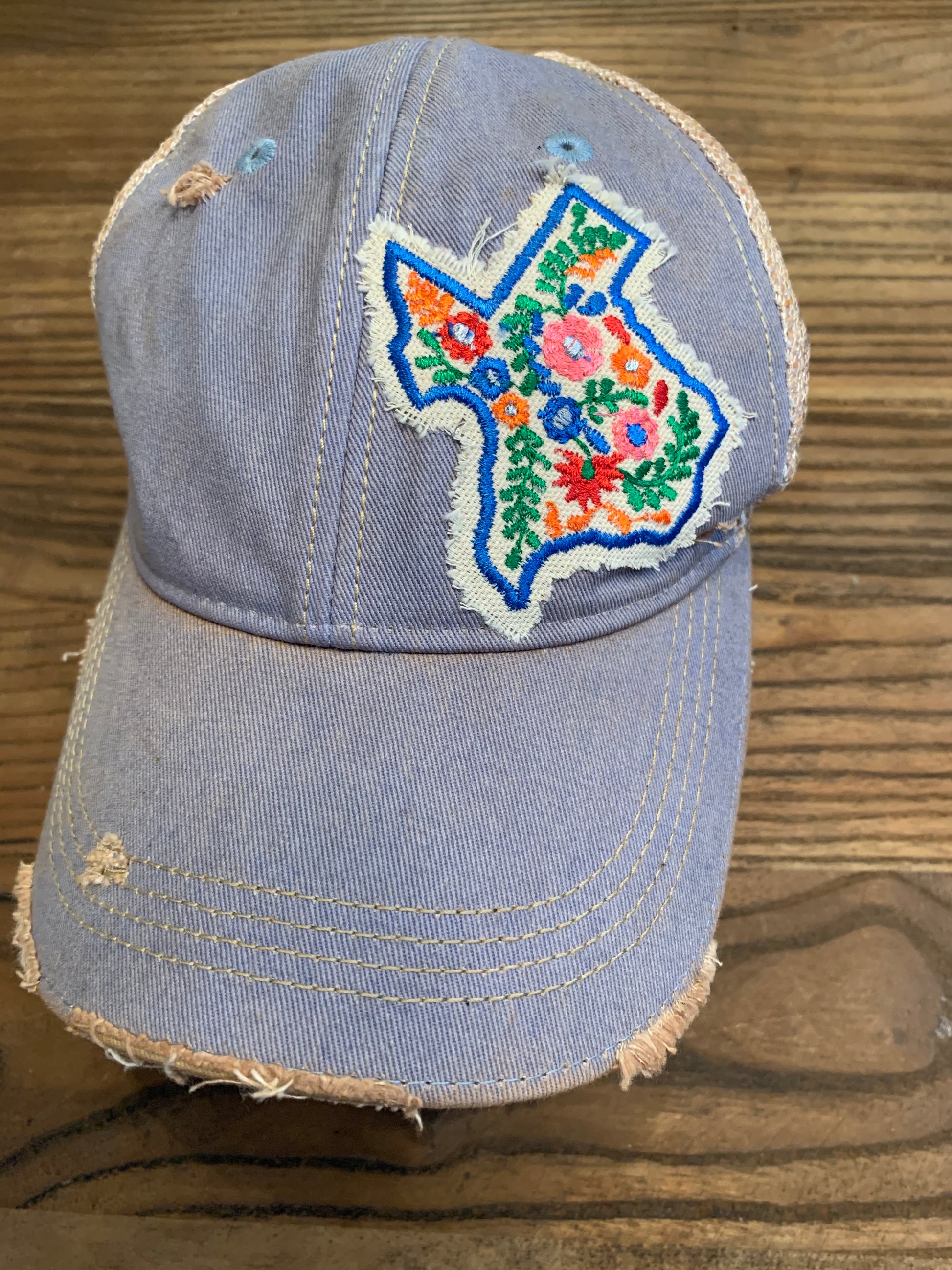 Distressed light blue hat with a Texas Floral Patch with mesh back. Adjustable sizing.