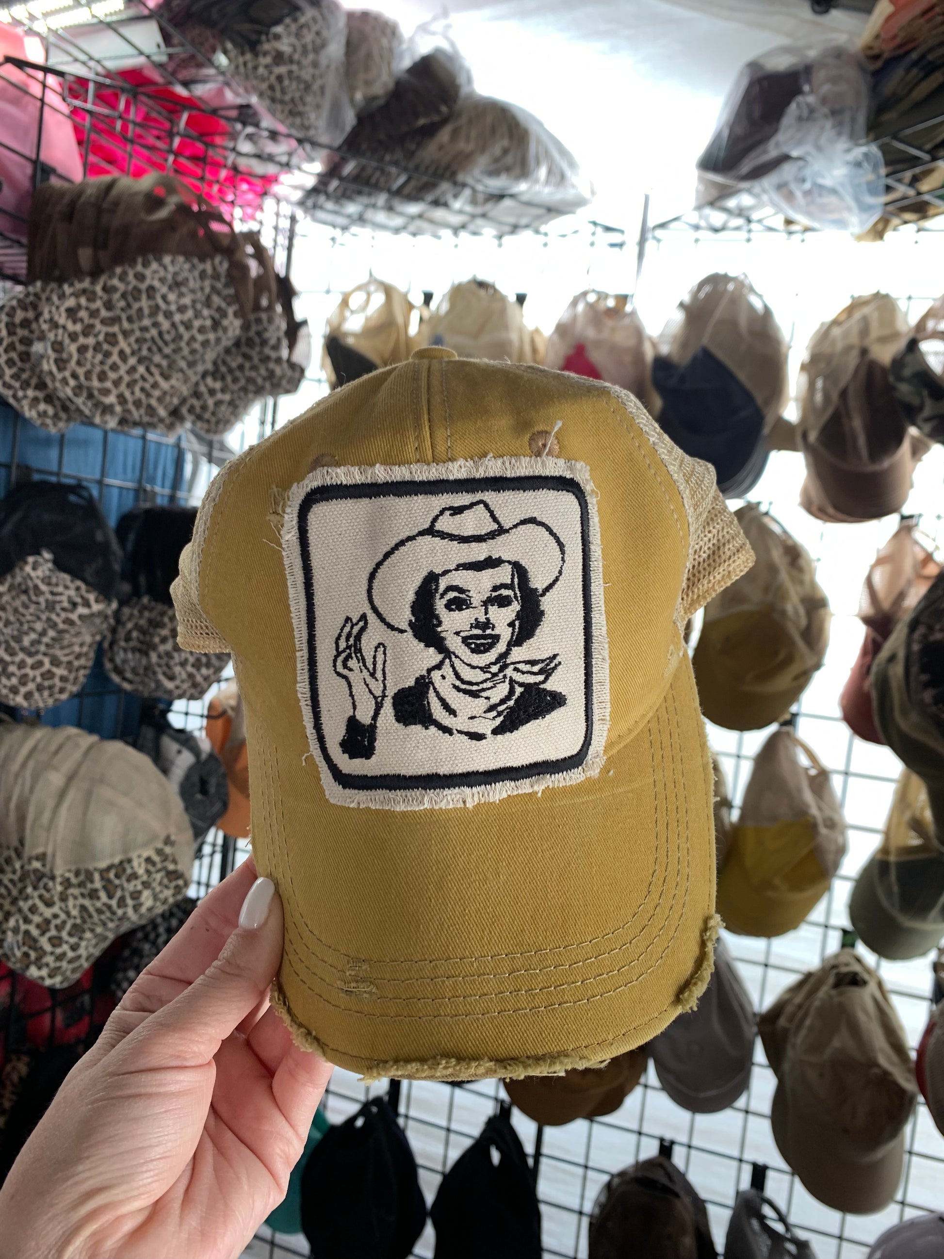On Mustard Yellow Distressed Hat with tan mesh snap back