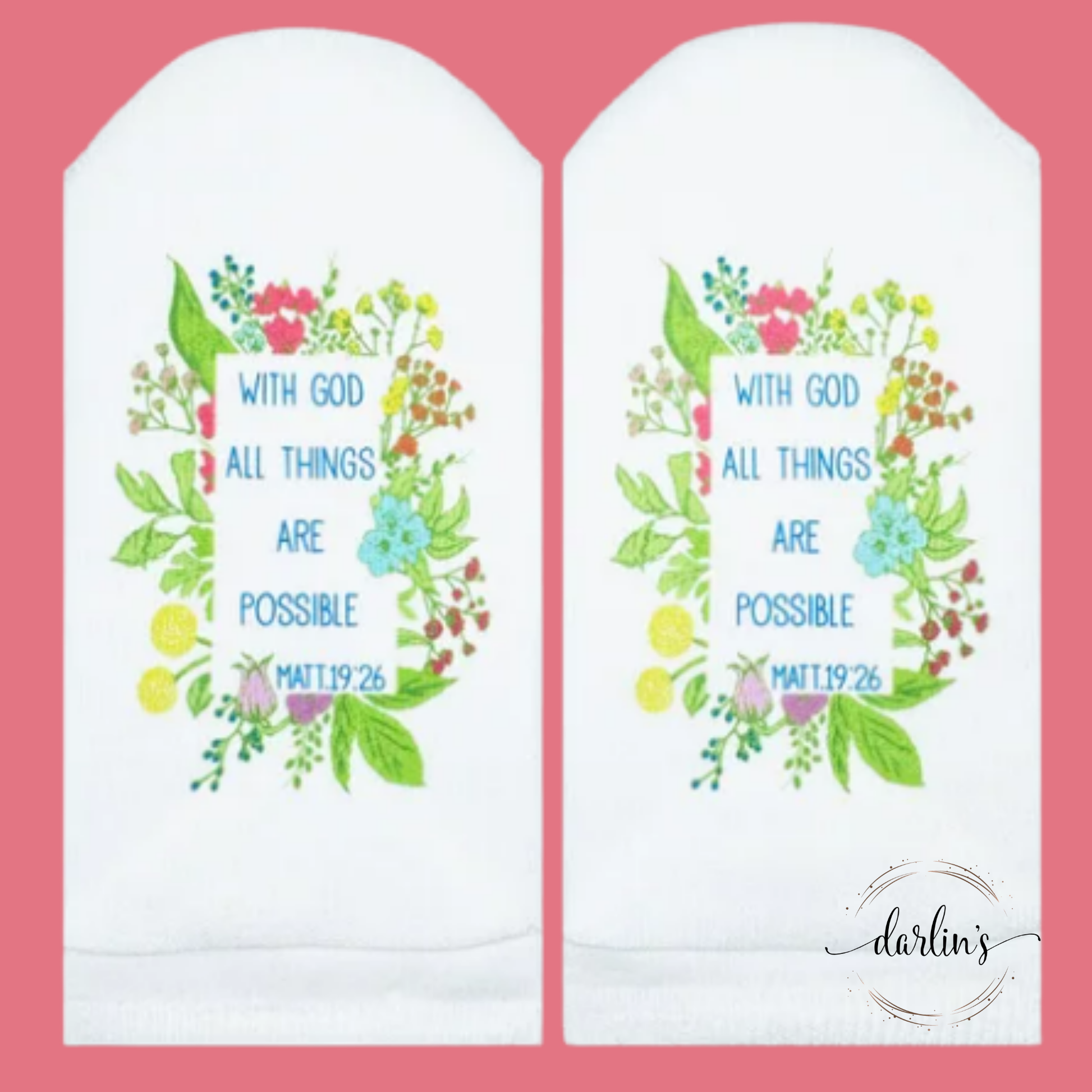 These elegant socks feature the inspiring verse from Matthew 19:26, "With God All Things Are Possible," serving as a powerful reminder of faith and limitless potential. The refined design subtly incorporates this uplifting message, making these socks a meaningful accessory for those who value both style and spiritual encouragement. Perfect as a thoughtful gift or a personal symbol of hope and perseverance, they blend timeless elegance with heartfelt inspiration.