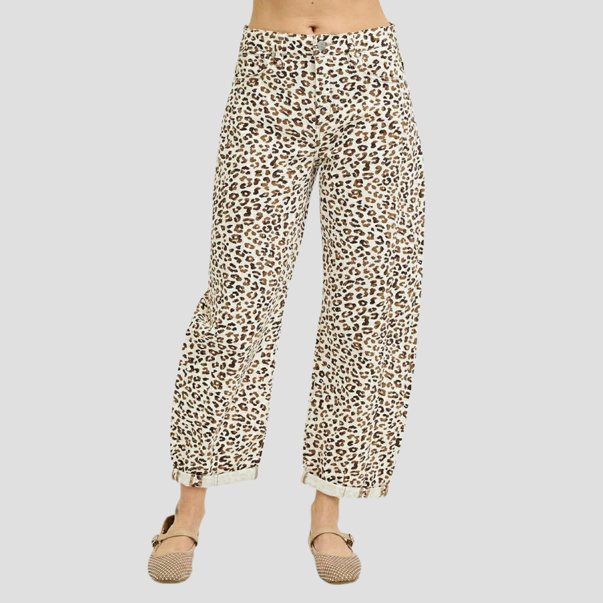 Elevate your casual style with these cream leopard print cuffed jeans that strike the perfect balance between fun and fabulous. Crafted from a soft, breathable blend, they feature a relaxed silhouette with signature rolled cuffs that give off effortless cool-girl energy. The neutral-toned leopard pattern brings just enough personality.